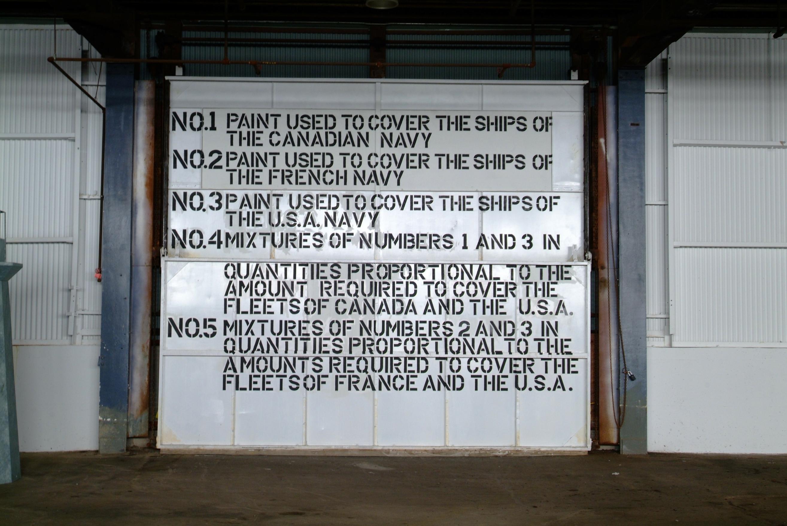 In 2005, Kennedy further explored creating visuals of military domination through ship paint colours with Number Painting. As he writes in Superstar Shadow: "Number Painting is a variation on Figure Paintings, a work I first presented at the 49th Parallel Gallery, New York, in 1985 (sic). In that work I attempted to comment on the military might of the United States in relation to its northern and southern neighbours – Canada and Mexico. Number Painting continues the theme of the dominant military power, but since the French fleet would be anchored in Halifax harbour during the course of the exhibition, I thought it would be more relevant to paint a comparison of Canada and France with the size and strength of the United States. I also exchanged the heading “Fig.” with “No.”: hence the title Number Painting."