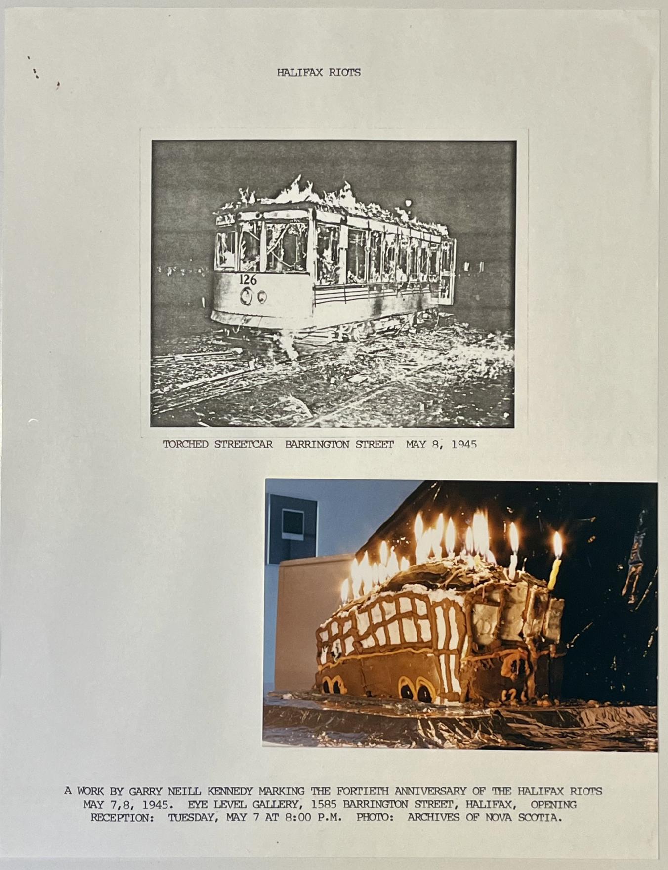 Kennedy further details the work: "During World War II celebrations in Halifax (1945), the Canadian troops rioted. One casualty was a torched Barrington Street trolly. A factual text of the event, appropriated from the local newspaper, is Dymo-taped in black and white around the frame of the large photo made from a negative I found in the Dalhousie University library archives. This augmented archival image is accompanied by a photocopy used to announce the exhibition Burning Halifax Streetcar (eyelevel gallery, 1985), and a slide of the commemoration (birthday) cake that I had made, complete with candles, of a miniature version of the streetcar."