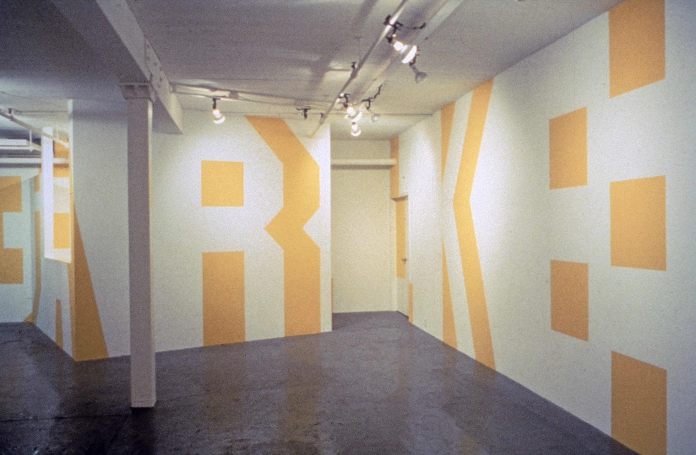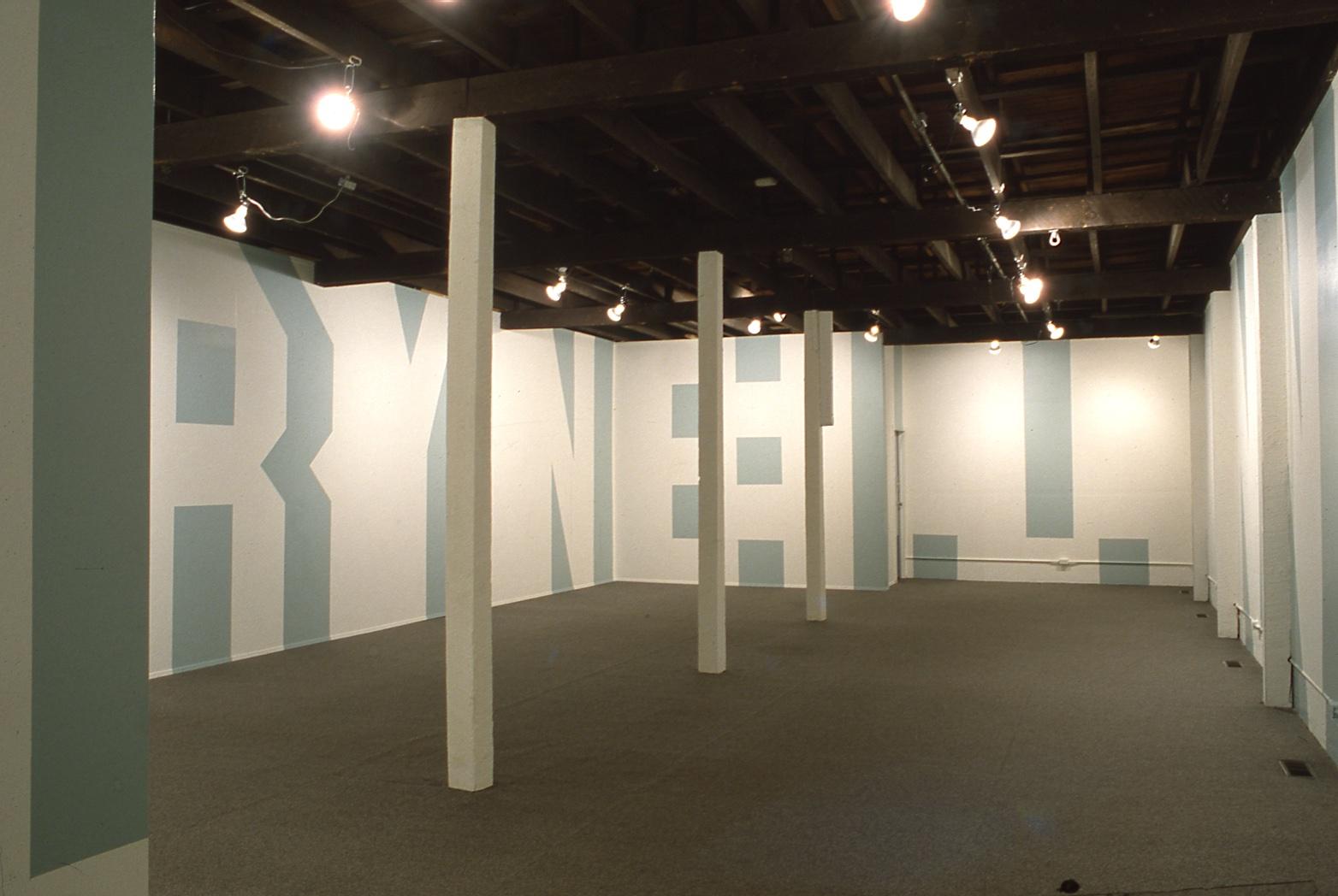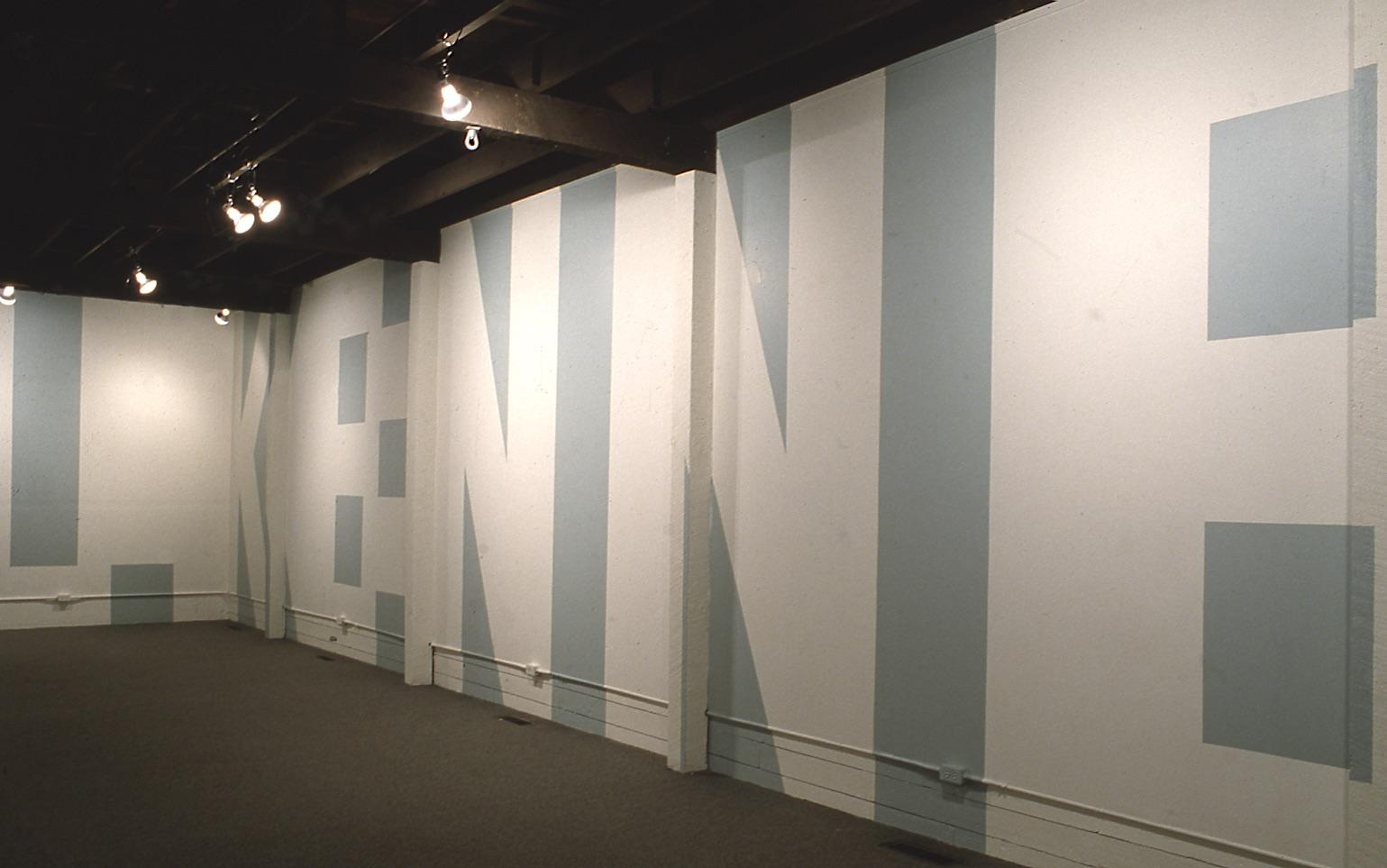 "In this work I painted my name from floor to ceiling, spacing the letters so as to cover all the walls of Stride Gallery. The work is painted in a variation of the typeface Superstar Shadow—altered so that its shadow was not cast below (to the right) but directly sideways (to the right). My name therefore is seen neither from above nor from below but head-on, at eye level, so to speak. Further, only the shadows are painted (with the same paint I used to cover the Canadian fleet—for no good reason other than because it was left over from Figure Painting in NYC. Also, I thought it would be nice to bring a touch of maritime colour to the west.) Mary Scott, who assisted me with the painting, was co-director of Stride with Don Corman—who also took the photos. Nancy Tousley wrote a review of the show for the Calgary Herald.