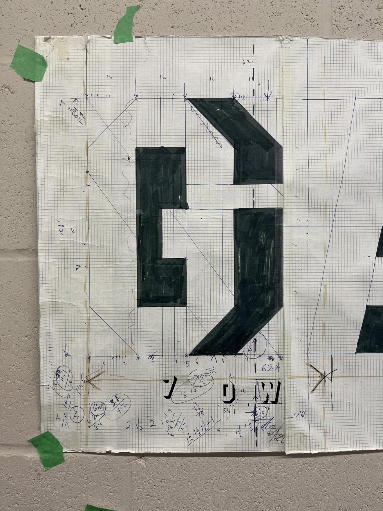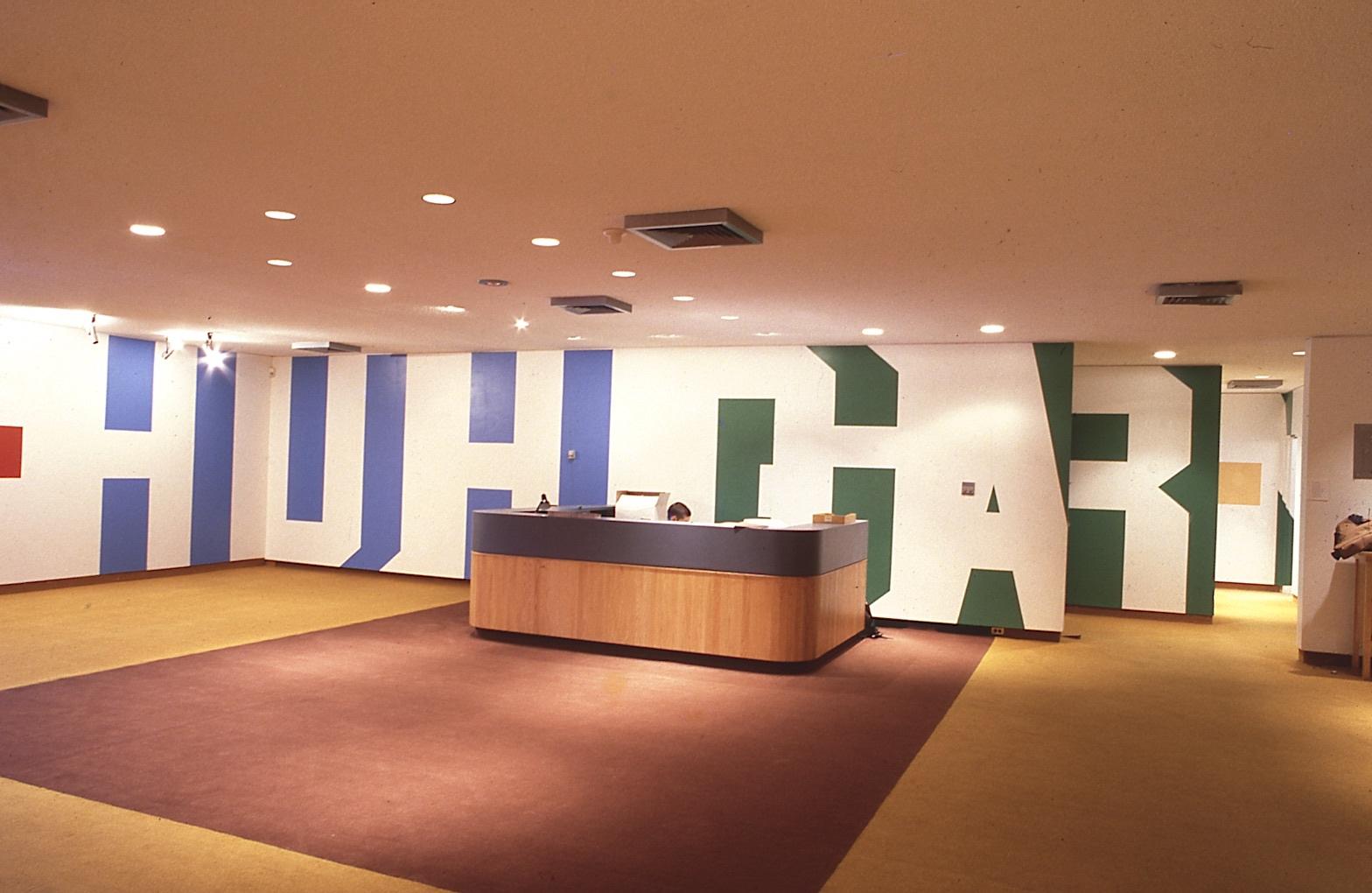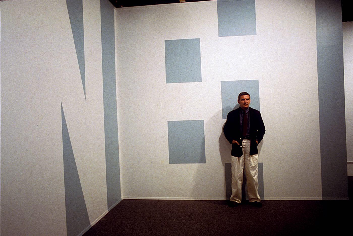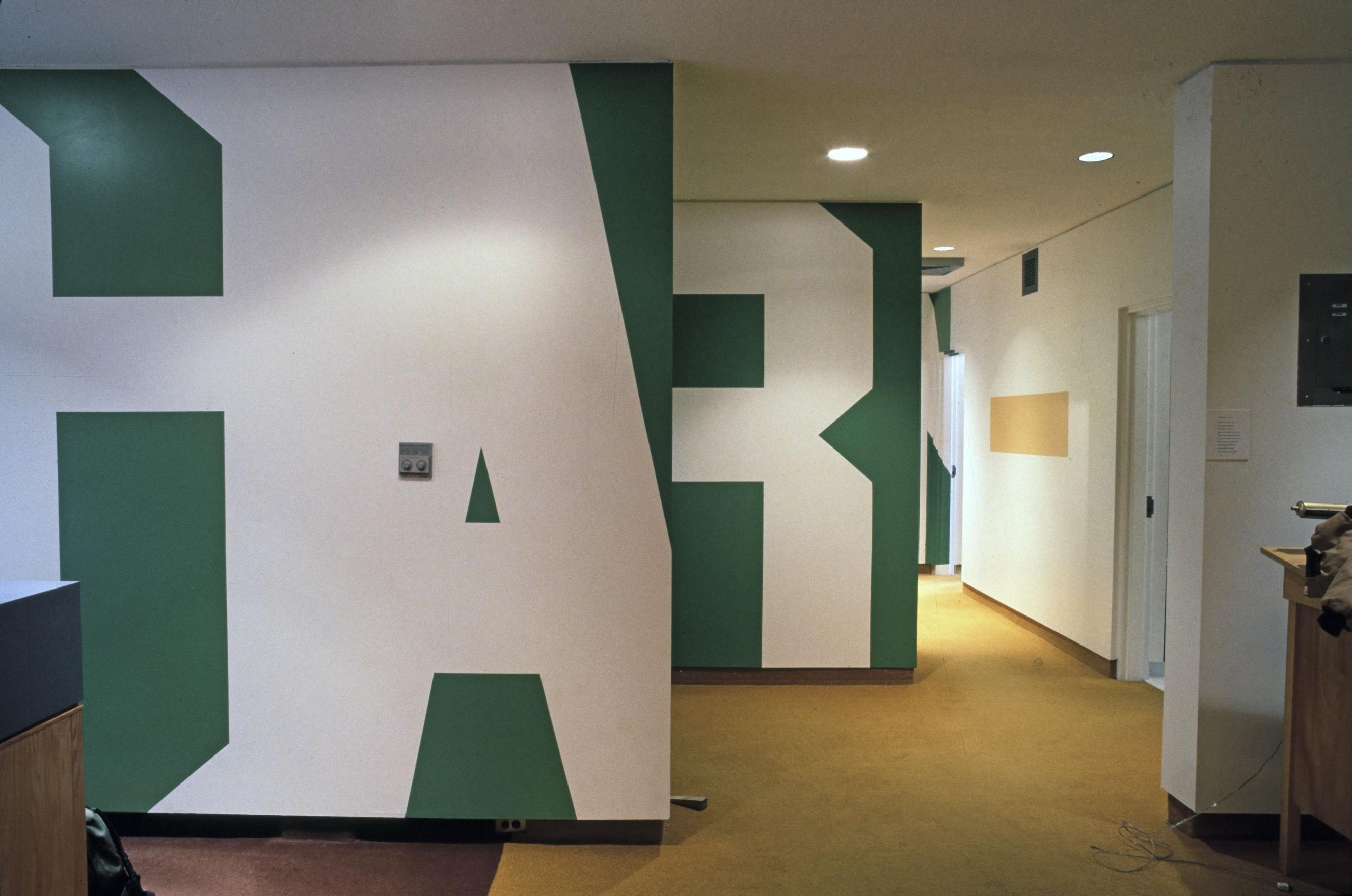"In this work I painted my name from floor to ceiling, spacing the letters so as to cover all the walls of Stride Gallery. The work is painted in a variation of the typeface Superstar Shadow—altered so that its shadow was not cast below (to the right) but directly sideways (to the right). My name therefore is seen neither from above nor from below but head-on, at eye level, so to speak. Further, only the shadows are painted (with the same paint I used to cover the Canadian fleet—for no good reason other than because it was left over from Figure Painting in NYC. Also, I thought it would be nice to bring a touch of maritime colour to the west.) Mary Scott, who assisted me with the painting, was co-director of Stride with Don Corman—who also took the photos. Nancy Tousley wrote a review of the show for the Calgary Herald.