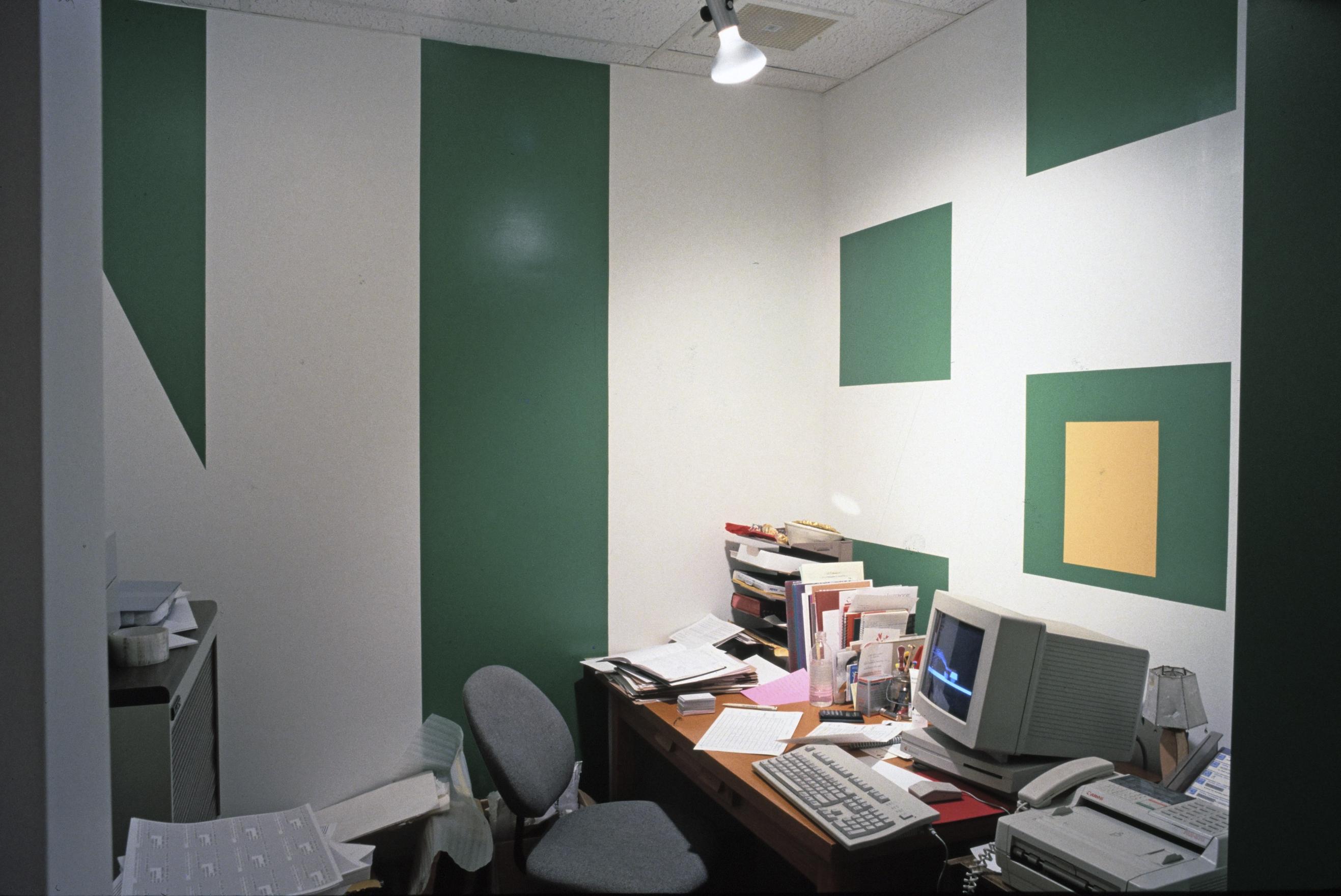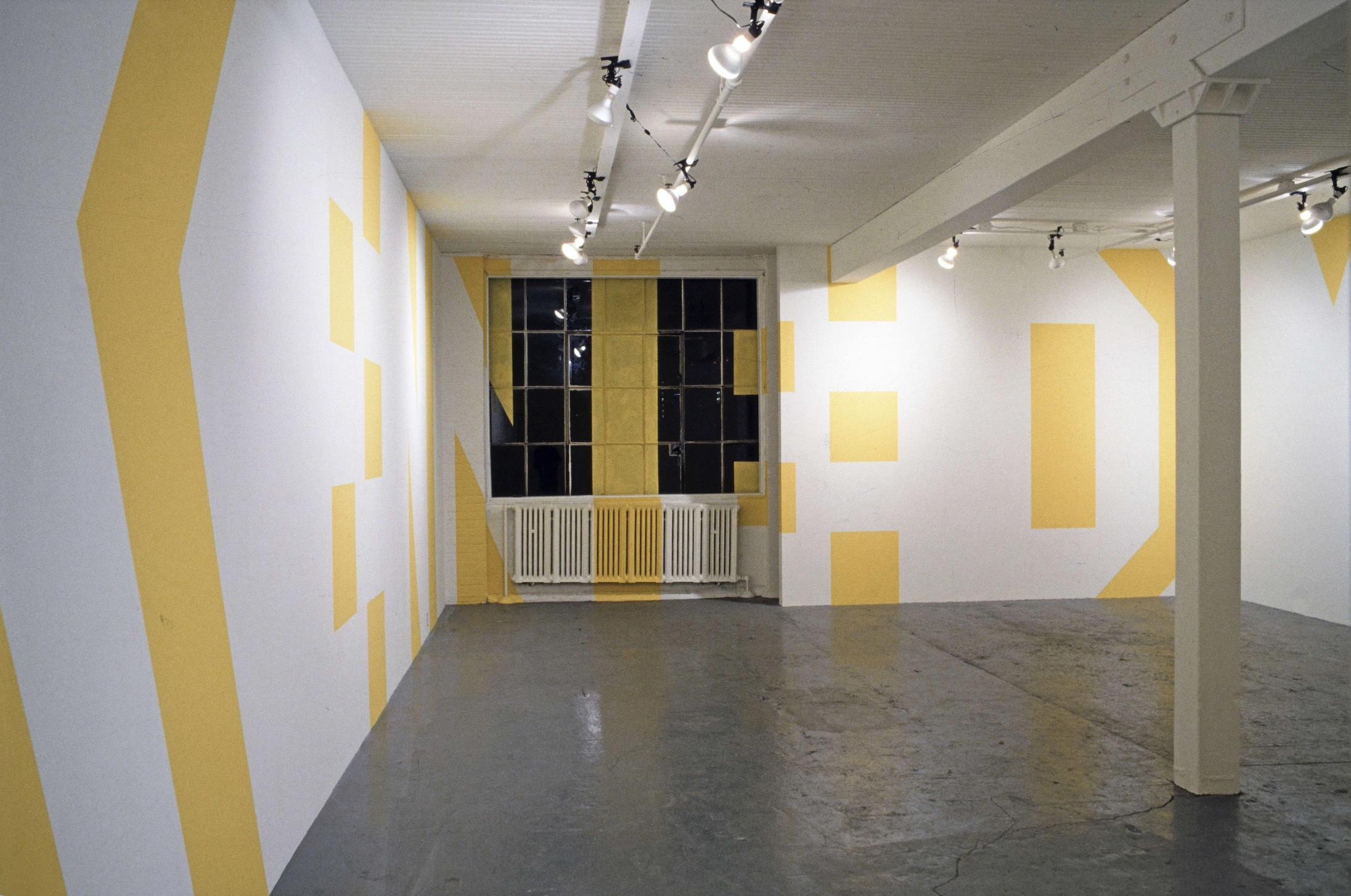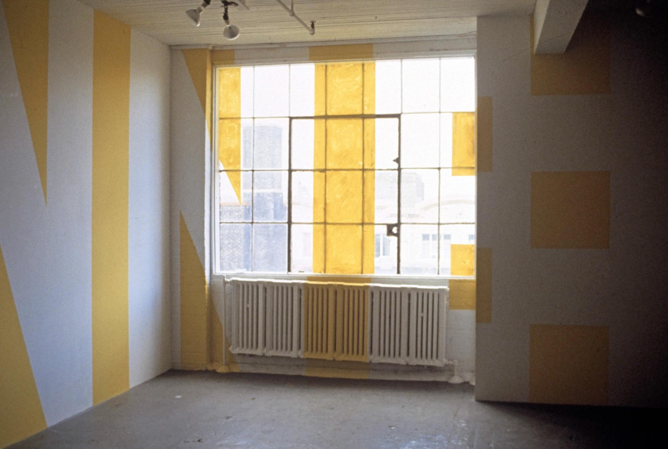 A year later when I made the same work at Cold City Gallery, Toronto, I used Pittsburgh Paints' Empire Yellow. This was the first of many works where I used paint companies' names to direct or influence the content of the work. The imperialistic gesture to take over the entire gallery space, by travelling my name throughout the office, over the windows and washroom doors was in sync with the colour selection. At the time Marlene Klassen was the director of Cold City Gallery."