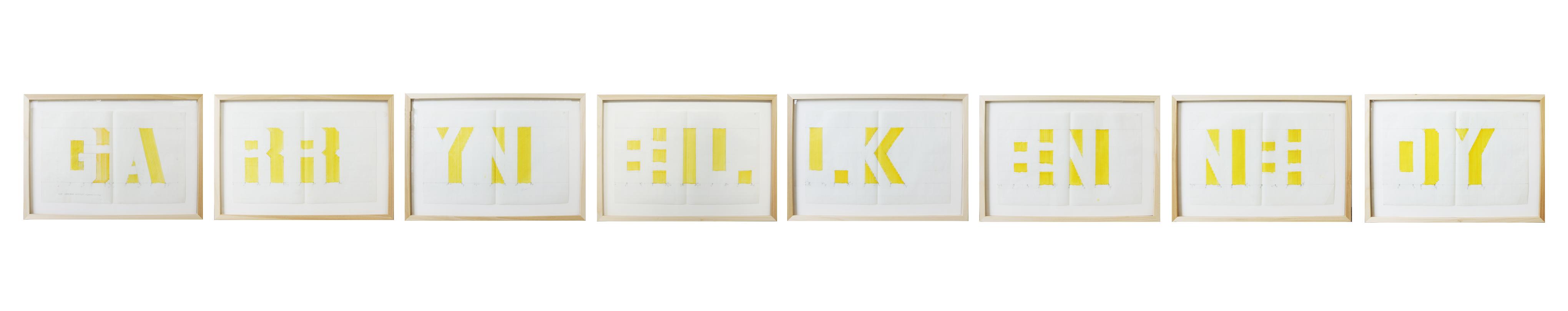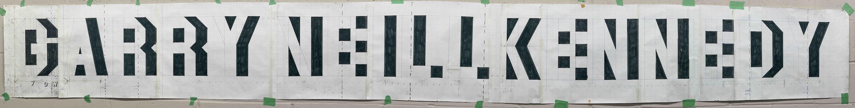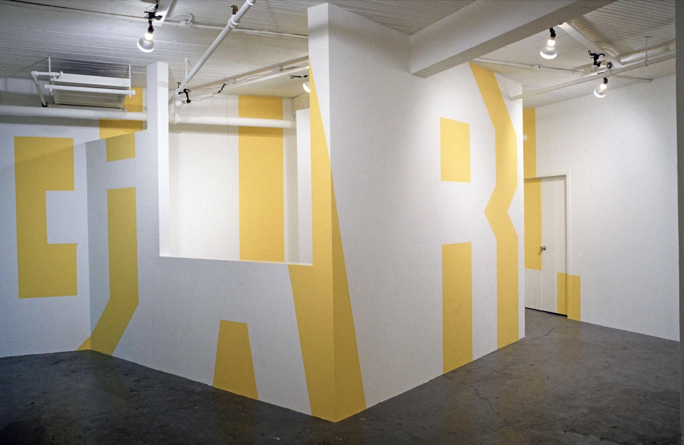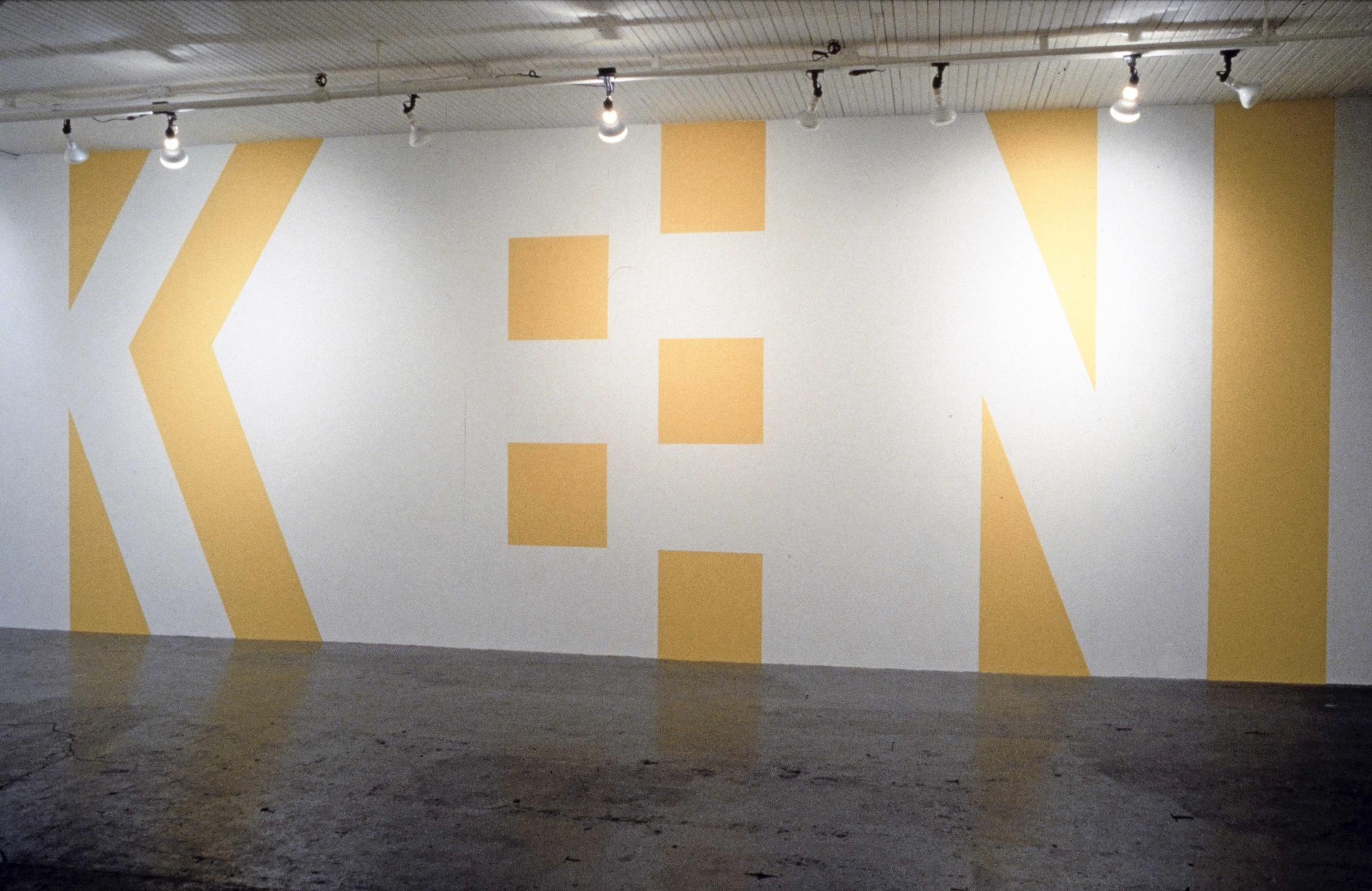 SUPERSTAR SHADOW is a wall-text painting for which Kennedy painted his name from floor to celling across the whole gallery space in his variation of the Superstar Shadow type face. He first installed the work in 1986 at Stride Gallery (Calgary), then again, this time using his iconic choice of Empire Yellow paint, at Cold City Gallery (Toronto). SUPERSTAR SHADOW was subsequently included in Kennedy's solo exhibition Wall Paintings and Related Works 1974-1995 at the Owens Art Gallery (Sackville, NB) in 1996, as well as in his retrospective Work of Four Decades which travelled from the Art Gallery of Nova Scotia (Halifax) to the National Gallery of Canada (Ottawa) and Beaverbrook Art Gallery (Fredericton, NB) between 2000-2001. The work was last installed at Nickle Art Museum (Calgary) in 2002.