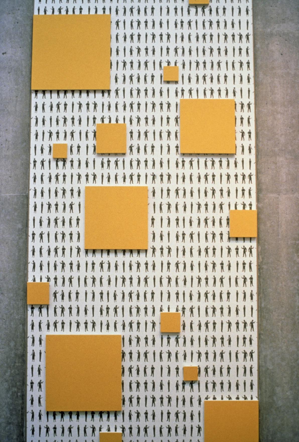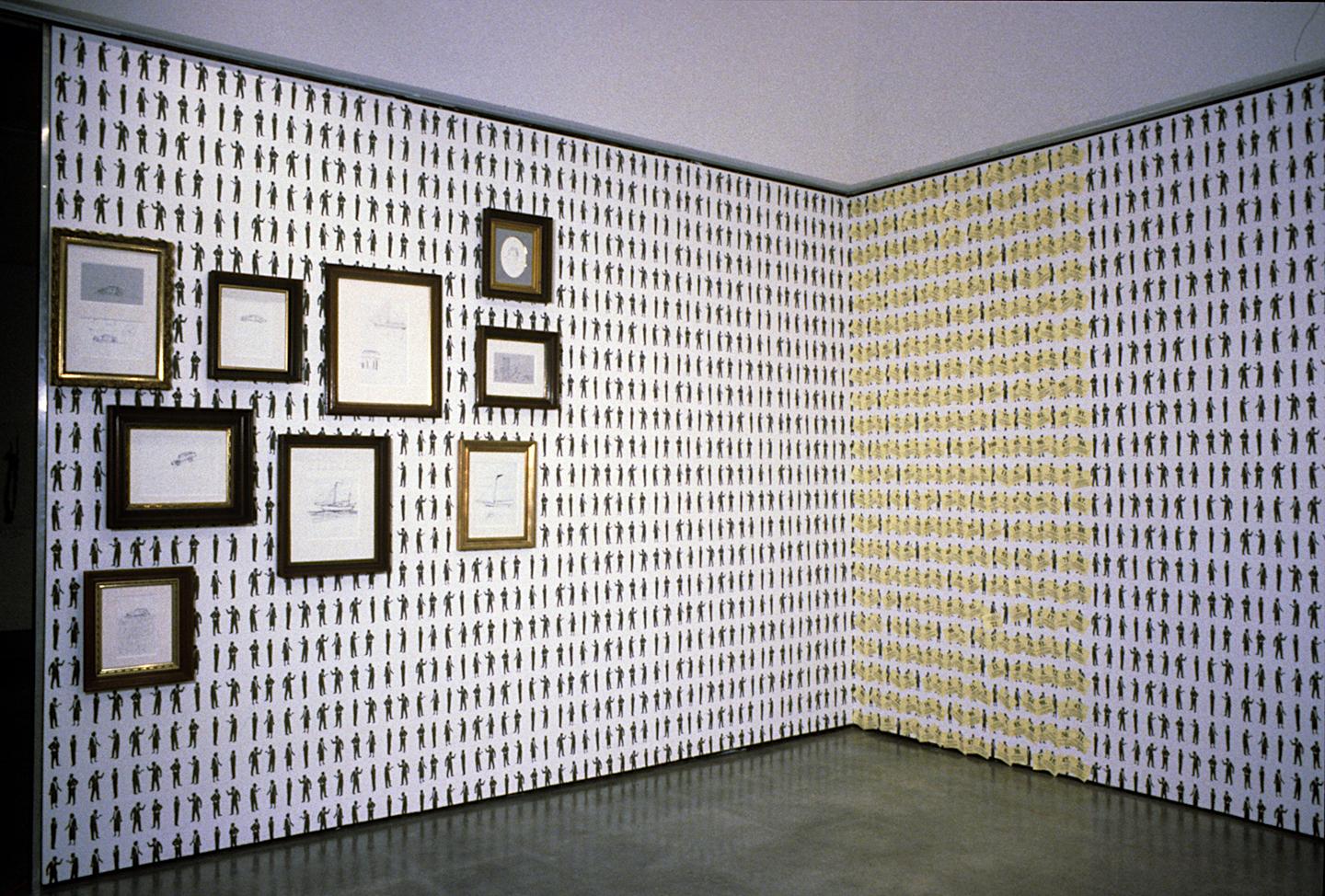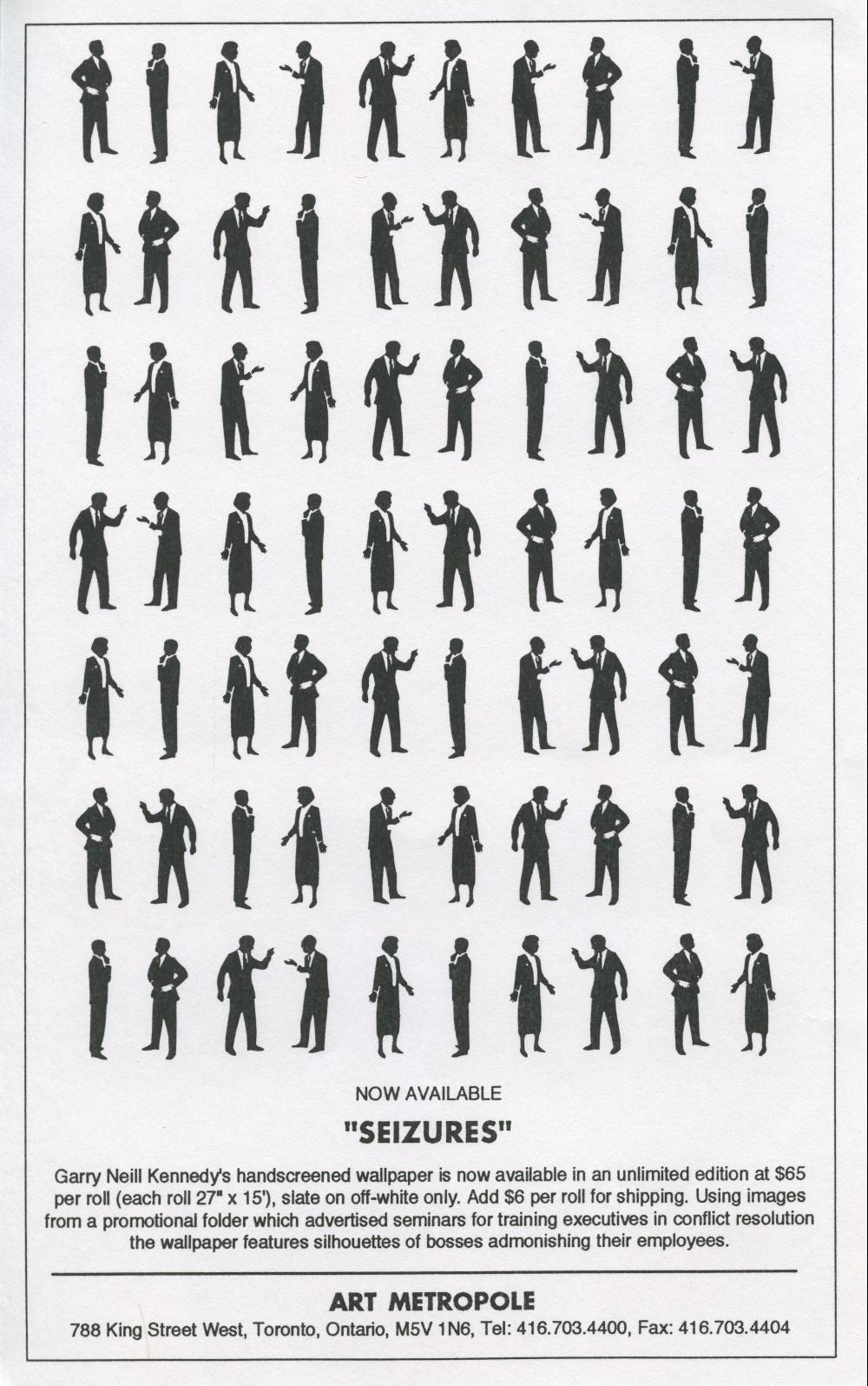 In 1993, Kennedy expanded this thread of "seizing" material relating to workplace hierarchies and power dynamics by creating a wallpaper for his installation in Art Work/Work Art: The Administrative Art of Garry Neill Kennedy (Owens Art Gallery, Sackville). Here, Kennedy covered the gallery walls with a grid of repeating black and white photocopied office worker silhouettes taken from the promotional material of a business consulting firm which advertised workplace conflict resolution training.