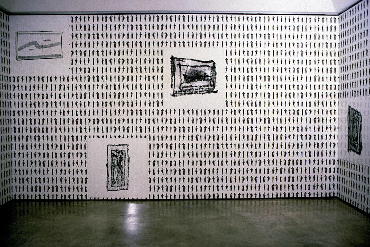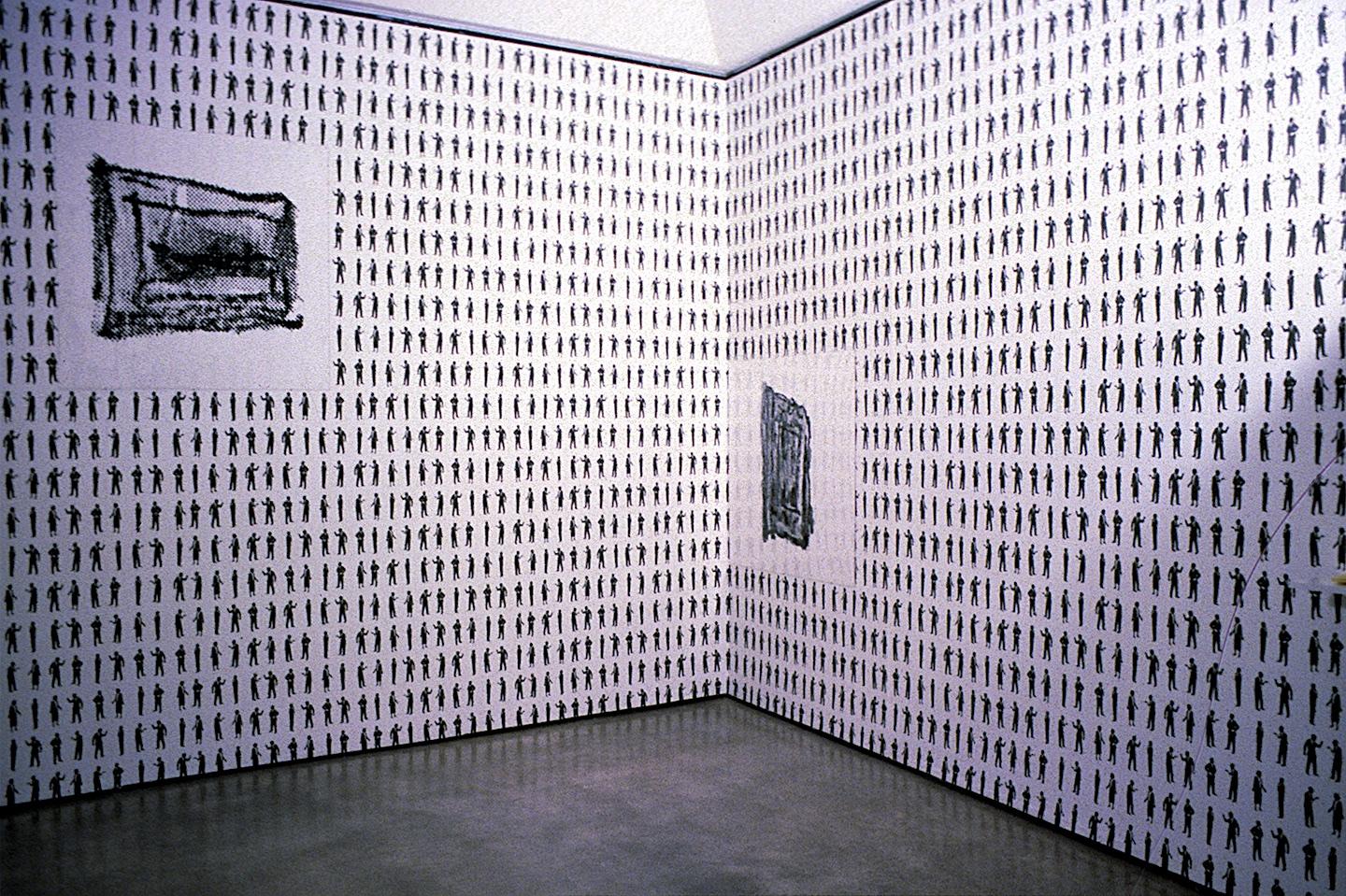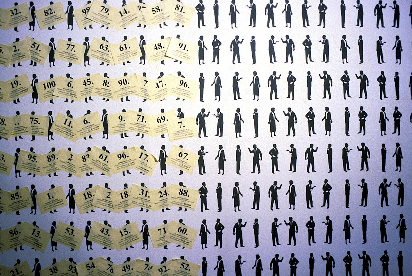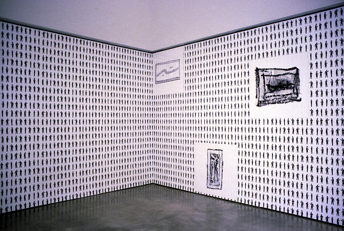 In 1993, Kennedy expanded this thread of "seizing" material relating to workplace hierarchies and power dynamics by creating a wallpaper for his installation in Art Work/Work Art: The Administrative Art of Garry Neill Kennedy (Owens Art Gallery, Sackville). Here, Kennedy covered the gallery walls with a grid of repeating black and white photocopied office worker silhouettes taken from the promotional material of a business consulting firm which advertised workplace conflict resolution training.