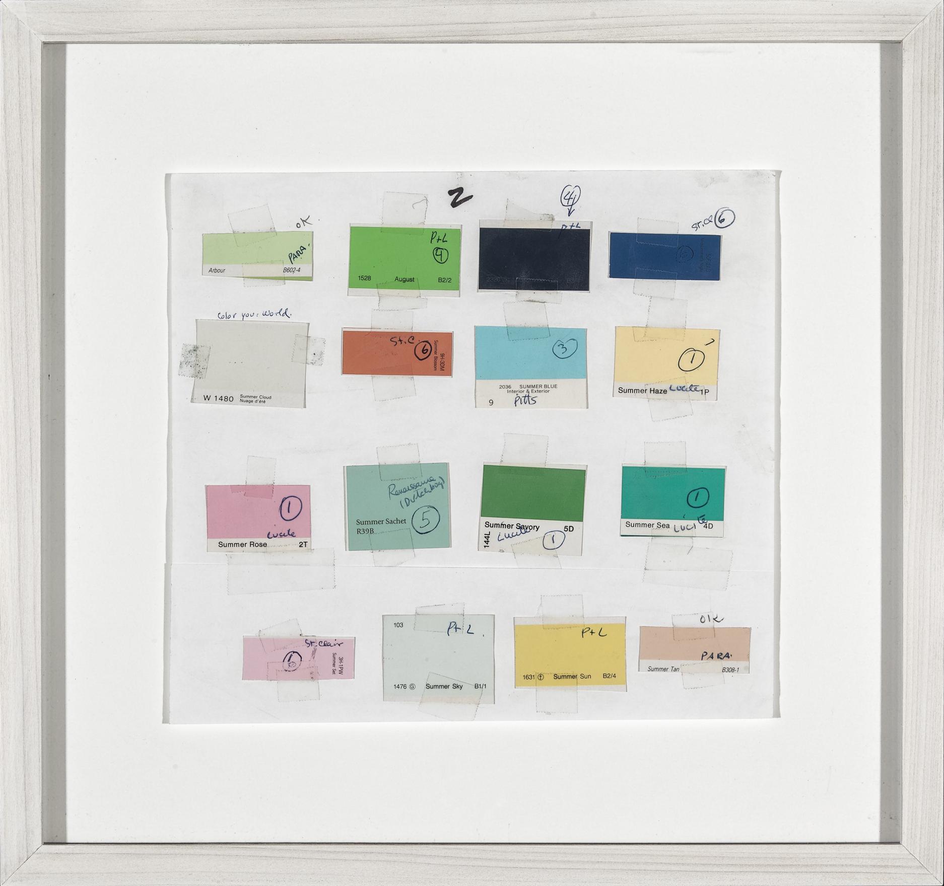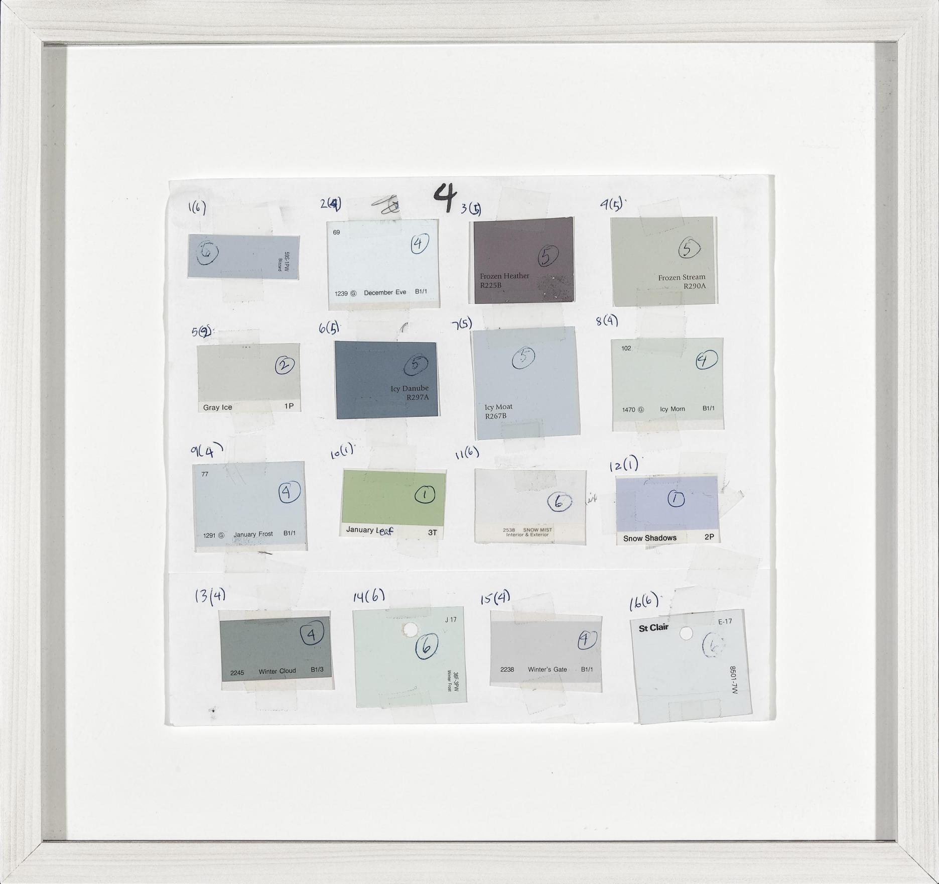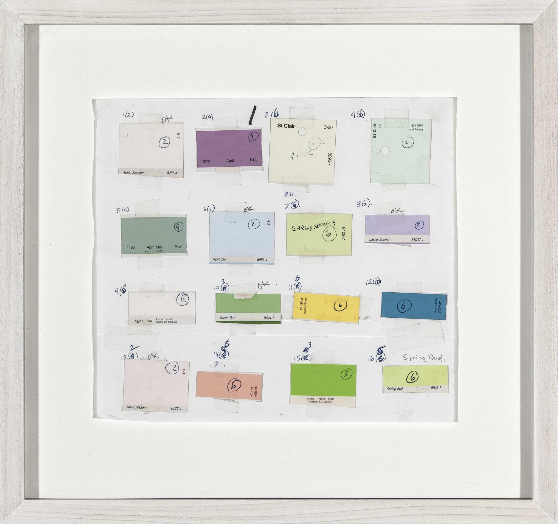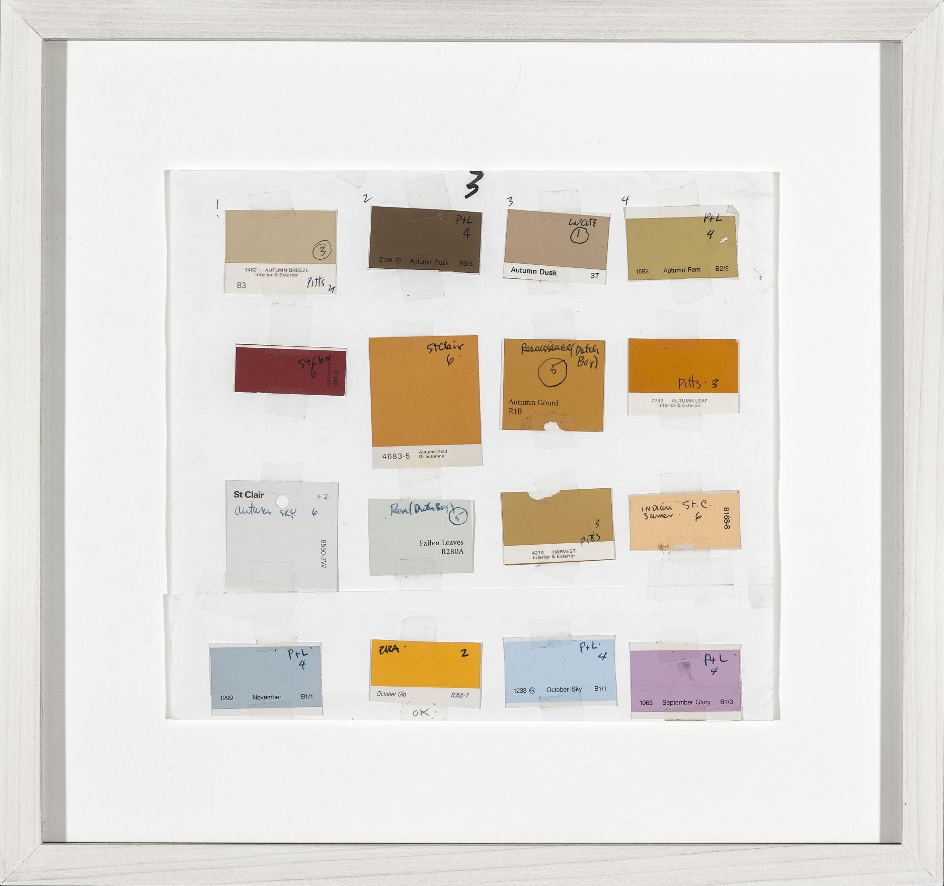 Part of Kennedy's exploration into the logic of commercial paint names, THE FOUR SEASONS is a series of paintings determined by the "seasonal" names of various colours. For this work, Kennedy utilizes a selection of colours from various house paint brands, creating one work per season using colours such as "April Mist" or Green Bud" for his spring painting, and "Autumn Gold" or "Fallen Leaves" for the autumn piece. Kennedy created multiple iterations of this work between the mid-1990s and early-2010s; including site-specific wall-paintings, canvas works and paintings on chipboard and pinstripe suit fabric.