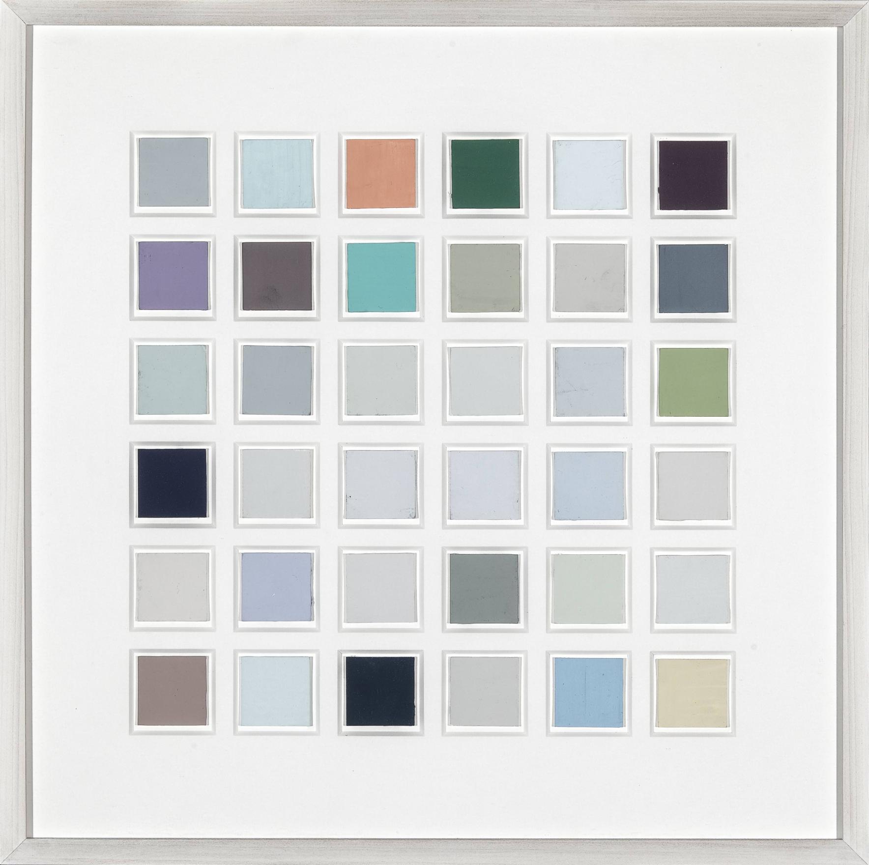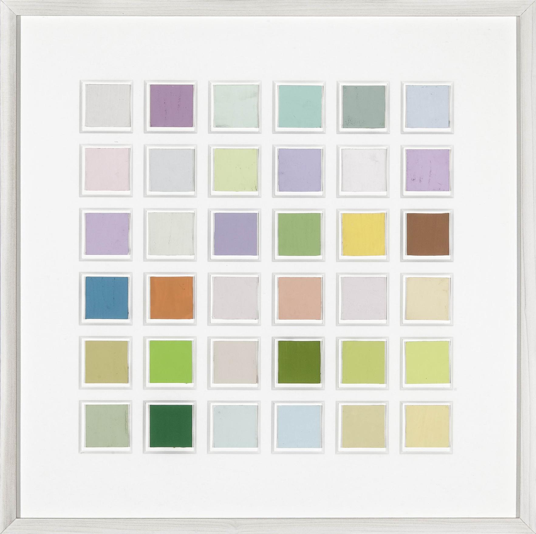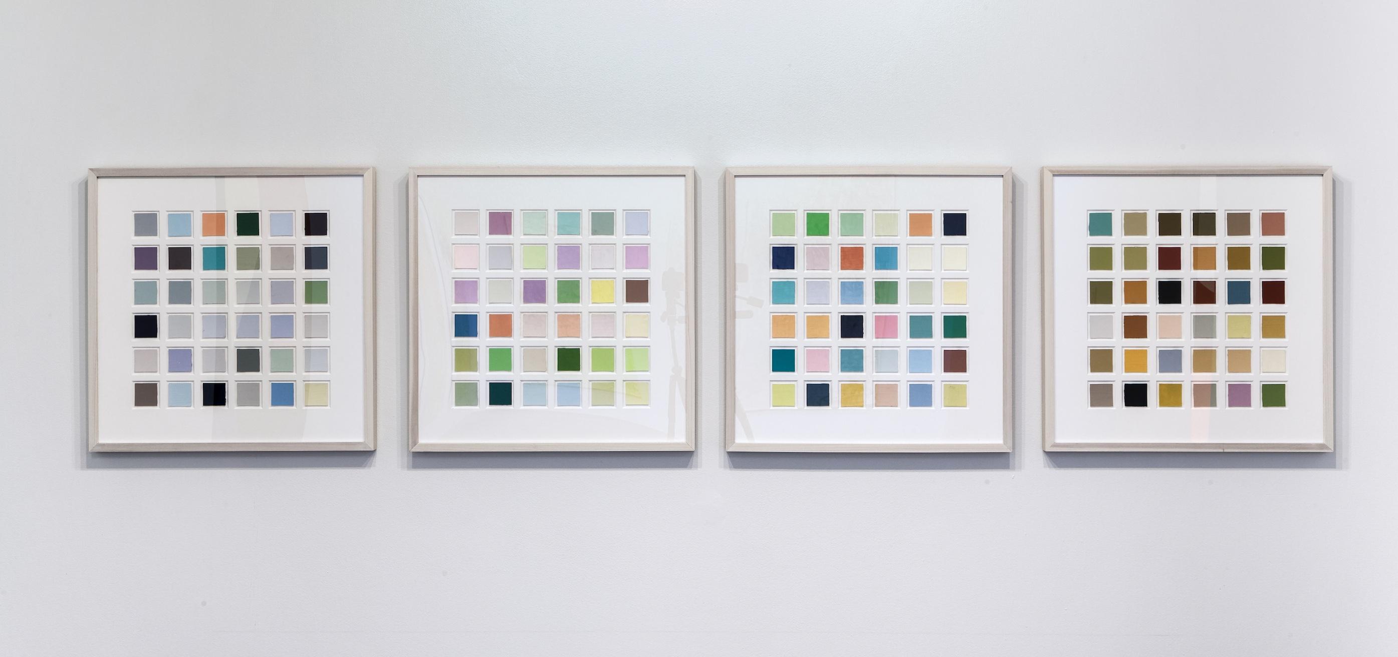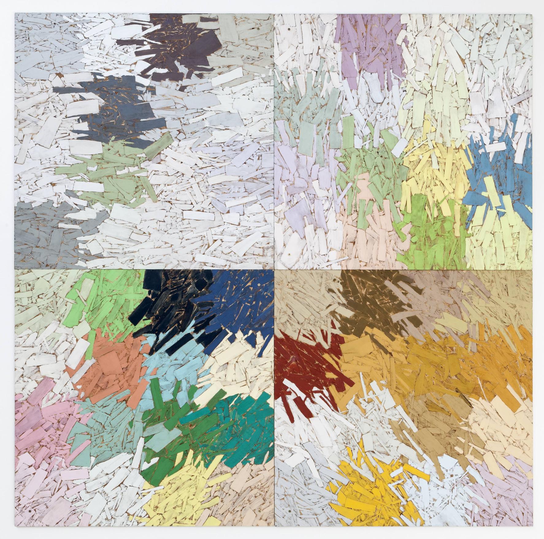 Part of Kennedy's exploration into the logic of commercial paint names, THE FOUR SEASONS is a series of paintings determined by the "seasonal" names of various colours. For this work, Kennedy utilizes a selection of colours from various house paint brands, creating one work per season using colours such as "April Mist" or Green Bud" for his spring painting, and "Autumn Gold" or "Fallen Leaves" for the autumn piece. Kennedy created multiple iterations of this work between the mid-1990s and early-2010s; including site-specific wall-paintings, canvas works and paintings on chipboard and pinstripe suit fabric.