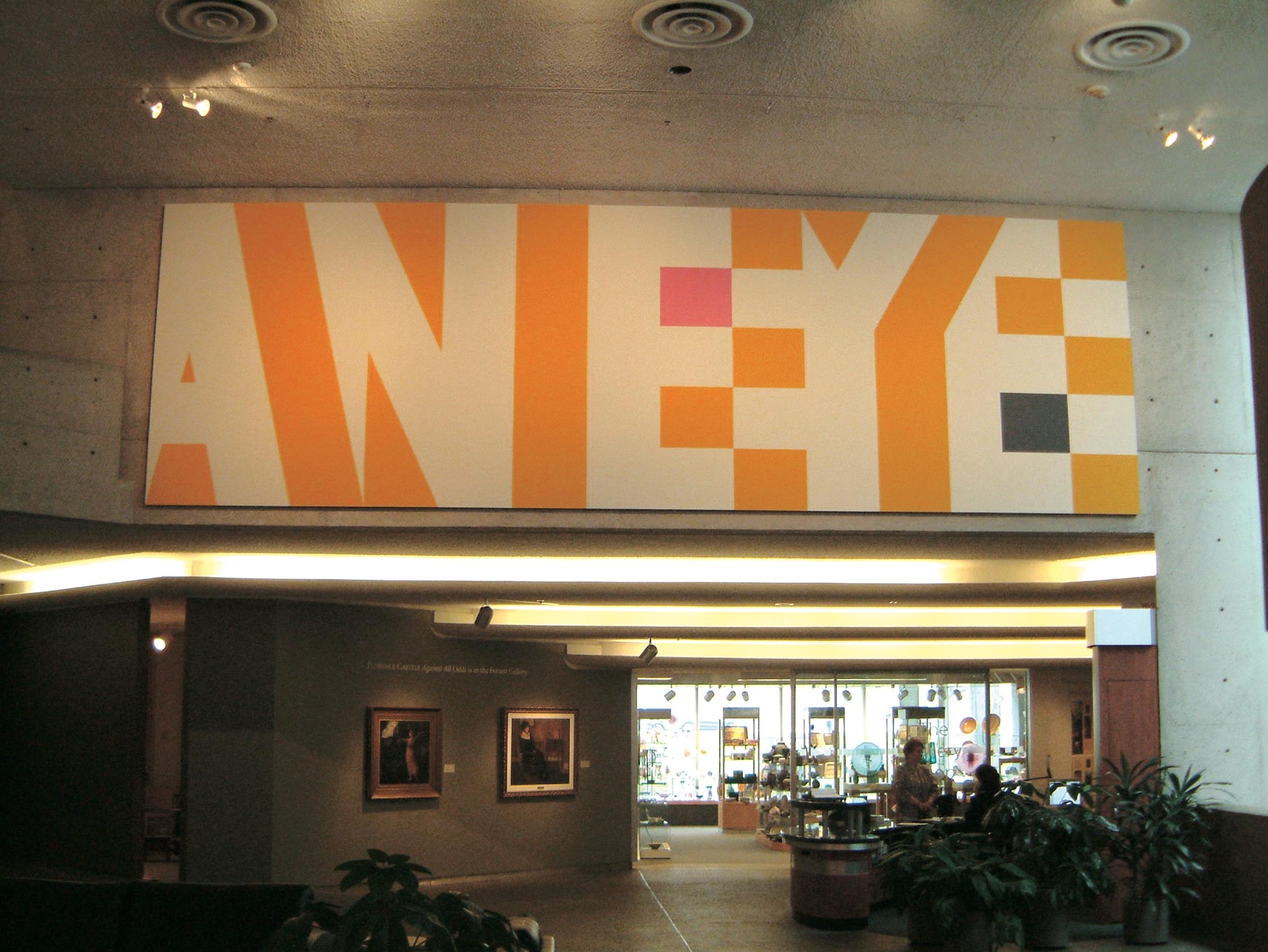 AN EYE FOR AN EYE was first exhibited at Museum London (Ontario) as a large scale wall-text painting and carpet installation in 2005. The colour palette for the painting matches the sixty IKEA "Ringum" carpets peppering the floor of the gallery.