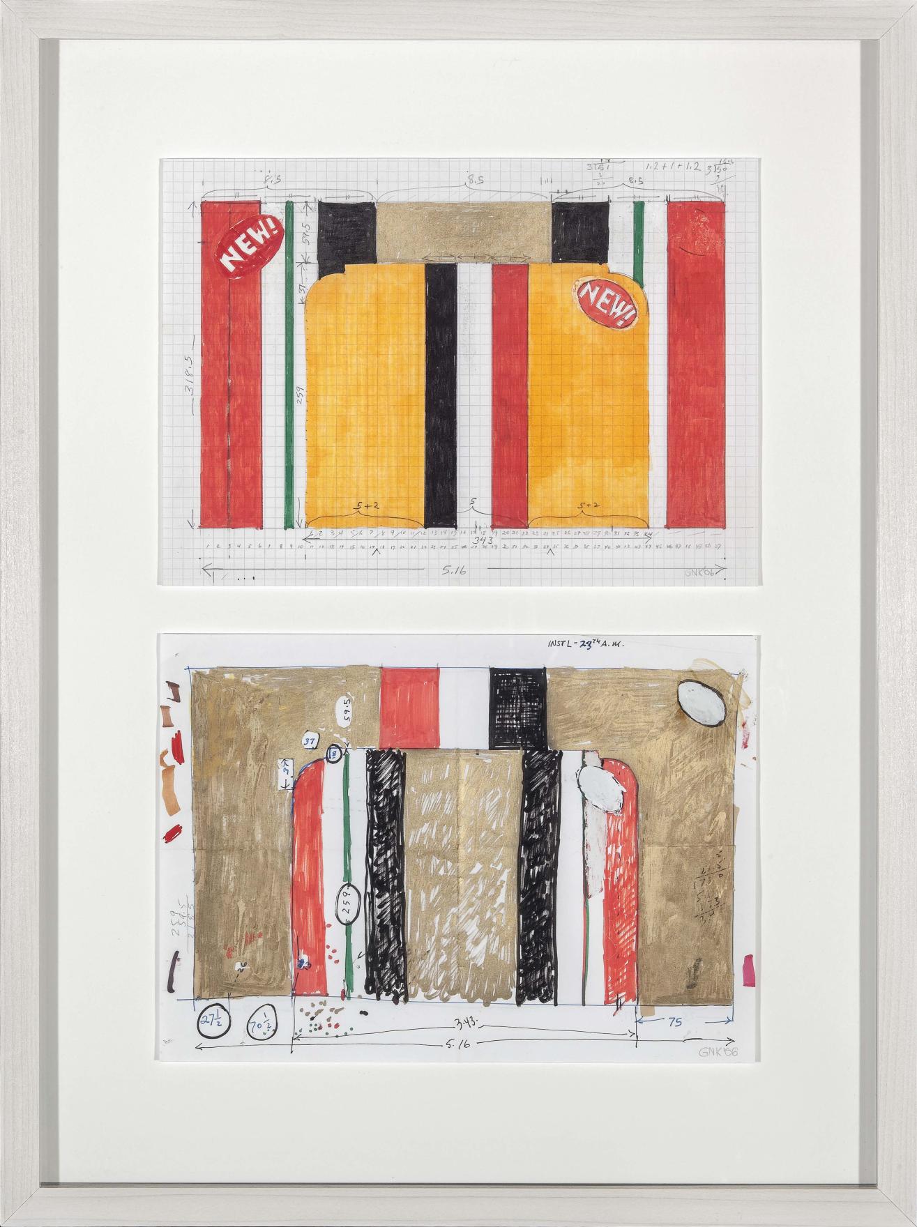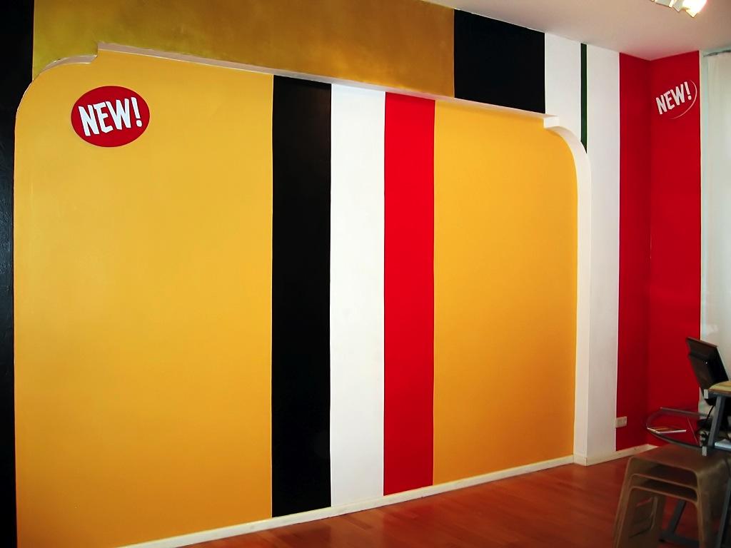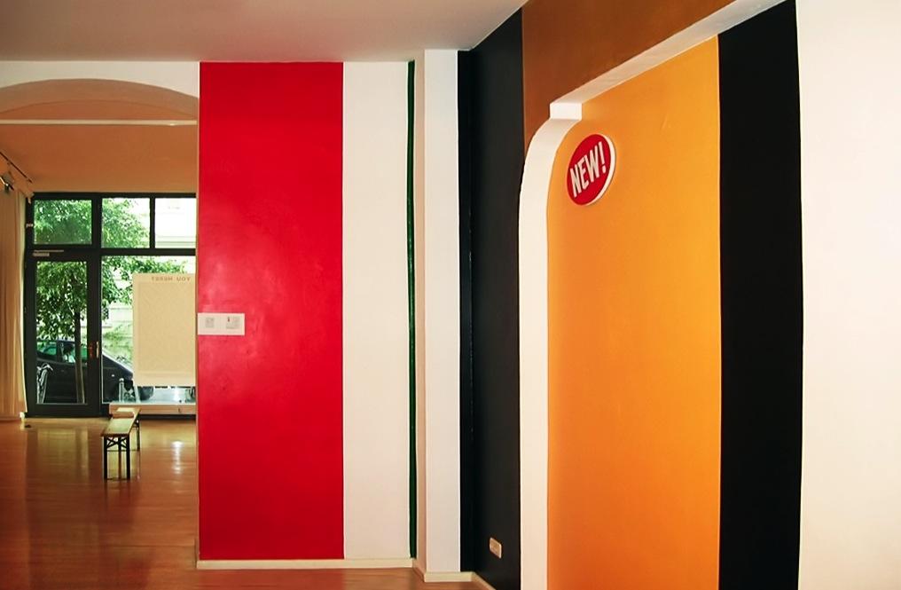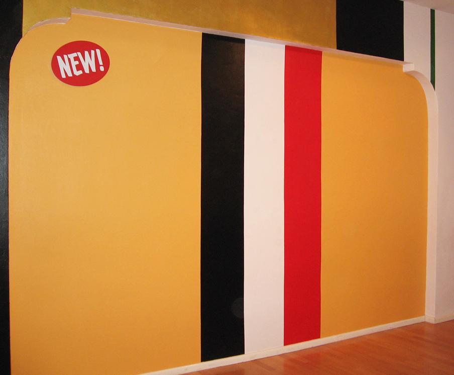 For Two New Wars (2006) Kennedy painted the walls of Emerson Gallery (Berlin, Germany) with the stripes of military service medal ribbons from the United States, around the top of the arch, and of Great Britain, on the inside of the arch. Taking special interest in the medal's advertisement design, Kennedy commissioned a sign painter to paint NEW! which was positioned to parallel the placement in the promotional material for the ribbons.