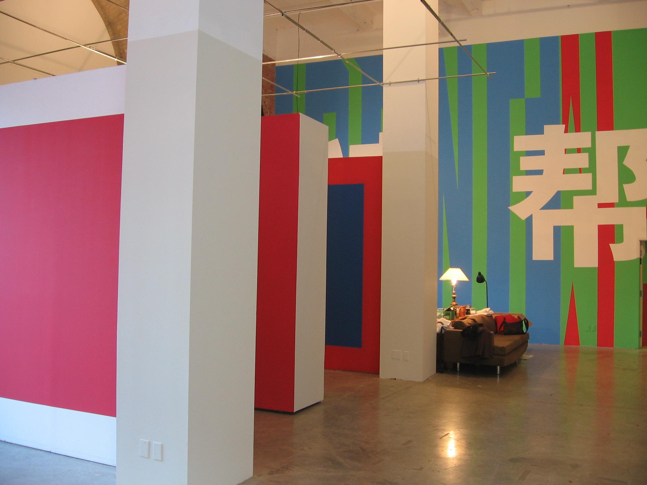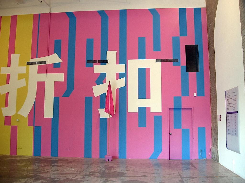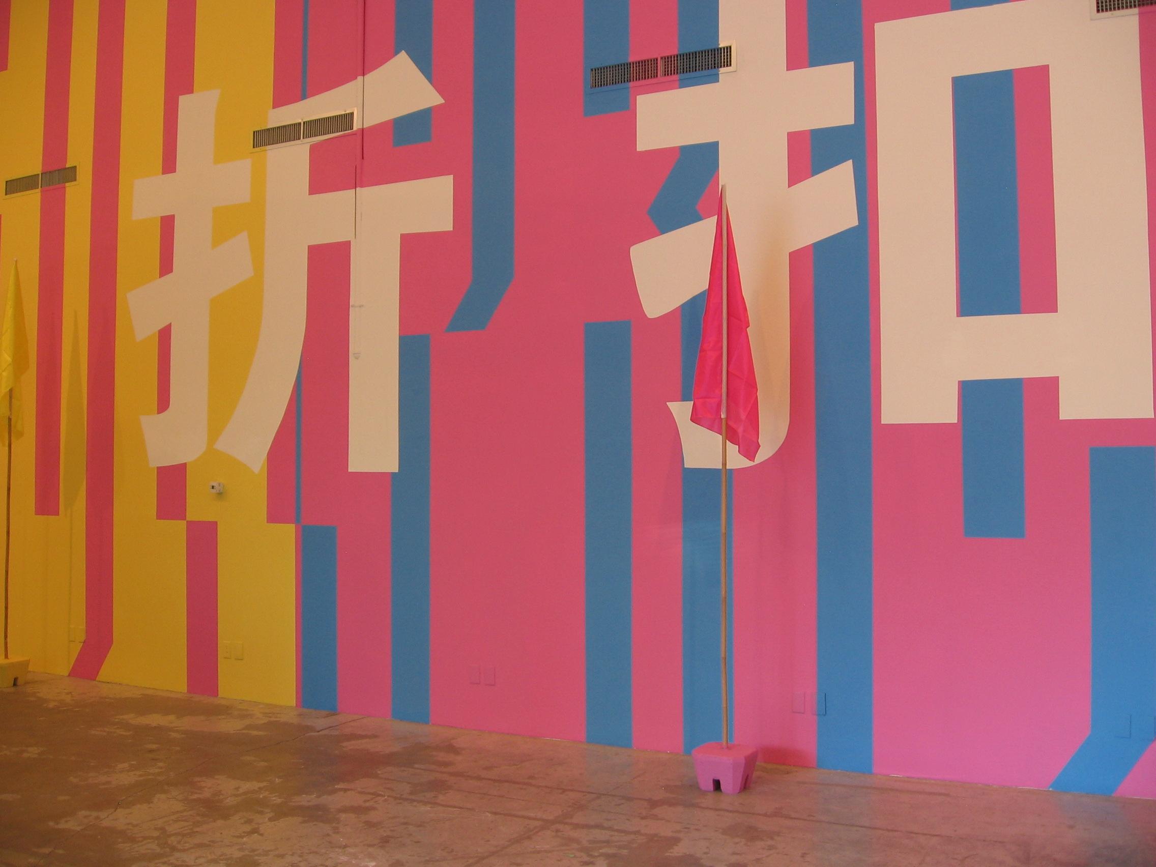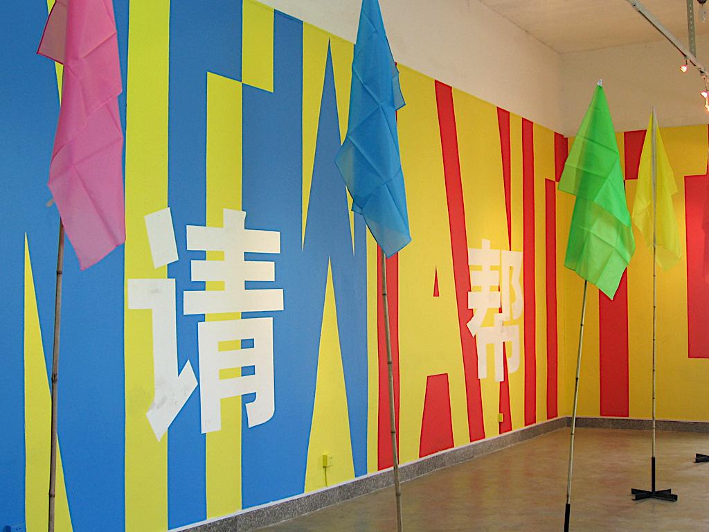 In 2008, Kennedy focused on the colours of "event flags" which were used around the city to indicate various events or city projects, including construction. By borrowing the title, I DON'T WANT TO PAY THE FULL PRICE, from the 2006 edition of the Lonely Planet Phrasebook—Mandarin, he paired a phrase of daily market bargaining with the larger socio-economic costs of city projects which were especially prevalent during the 2008 Beijing Olympic year. The resulting large scale wall-text painting was written in both English and Mandarin, employing the colours of these flags which were replicated in the gallery installation.