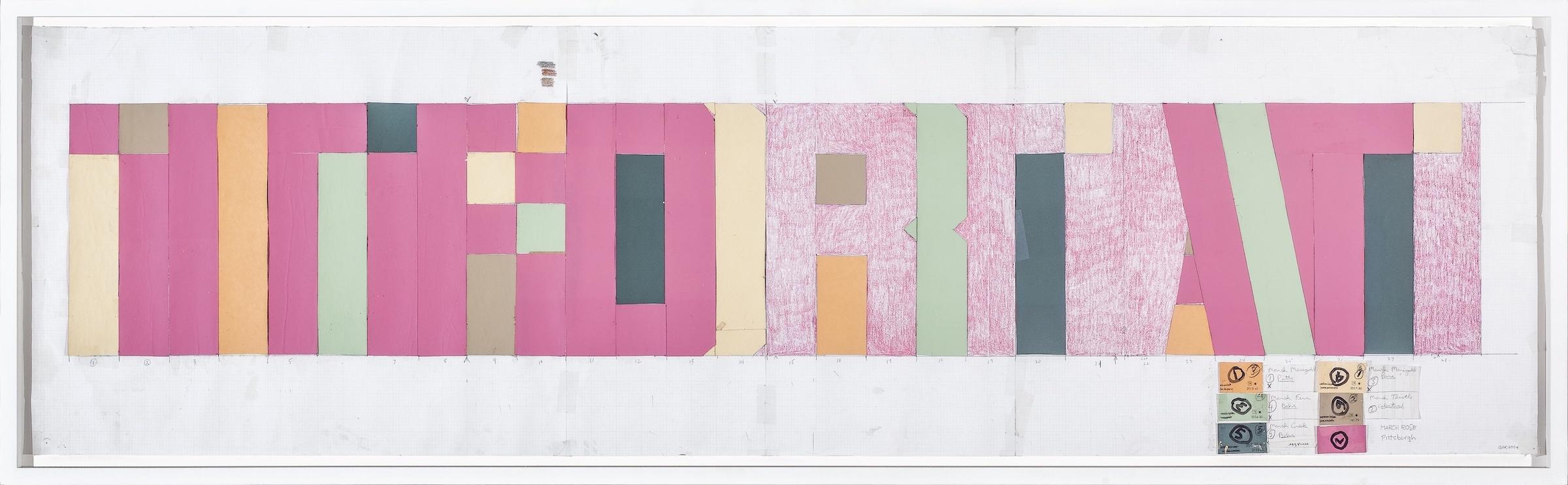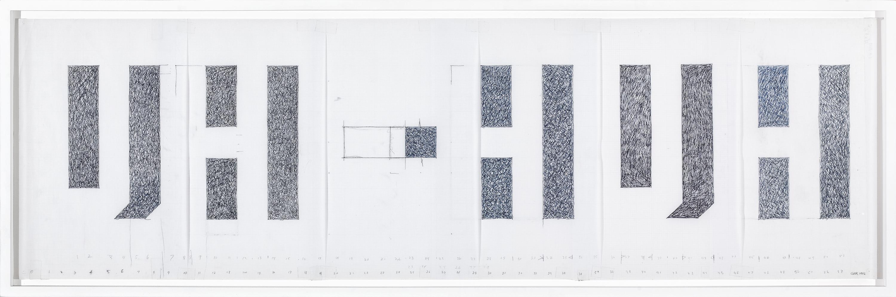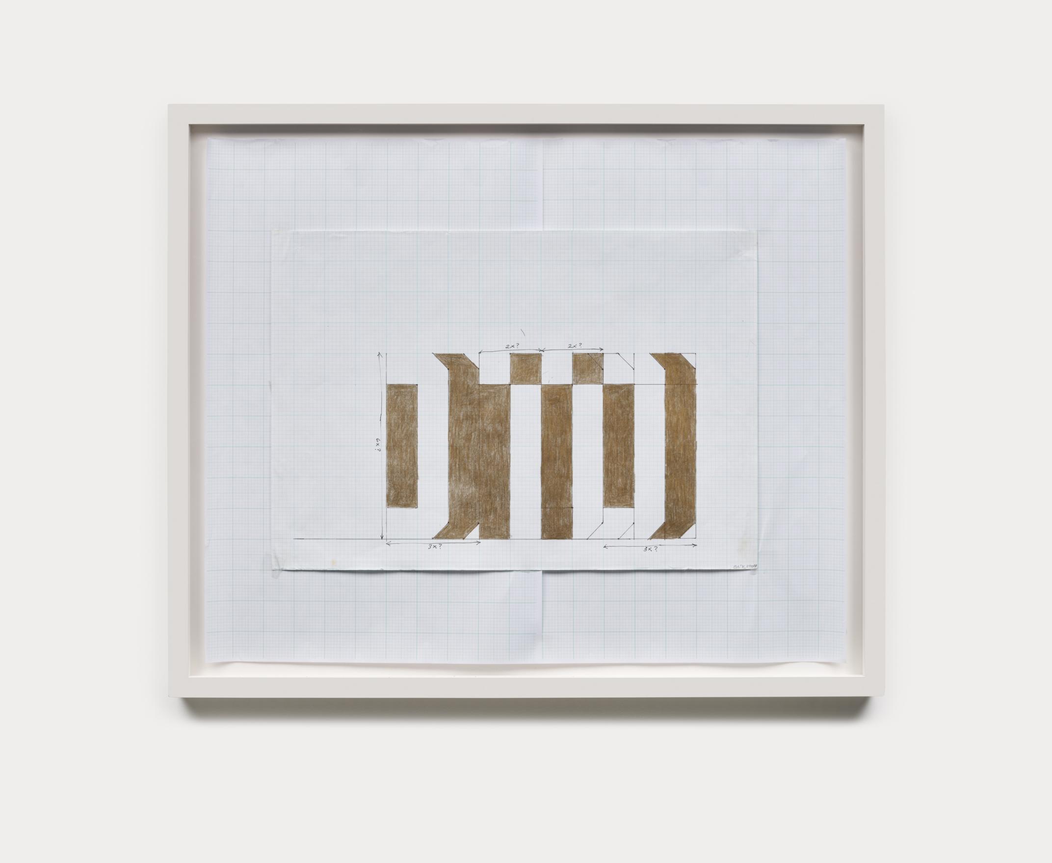 Over the years Kennedy created numerous scale drawing for his large wall-text paintings. This meticulous planning work tied in with his love of counting and rational art production. While installing, Kennedy would tack these drawings up by the walls he was working on, referring to them constantly while taping and measuring. These scale drawings provide a window into the reasoning and artistic logic underlying these iconic works.