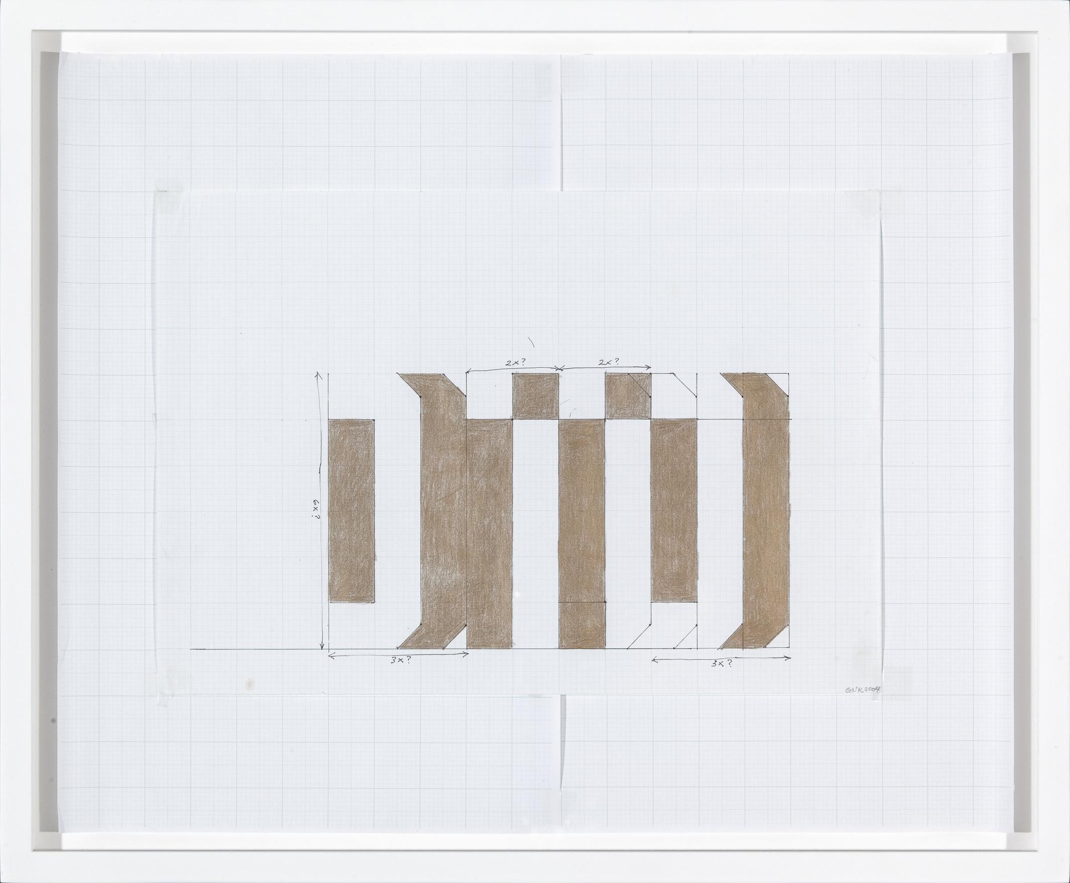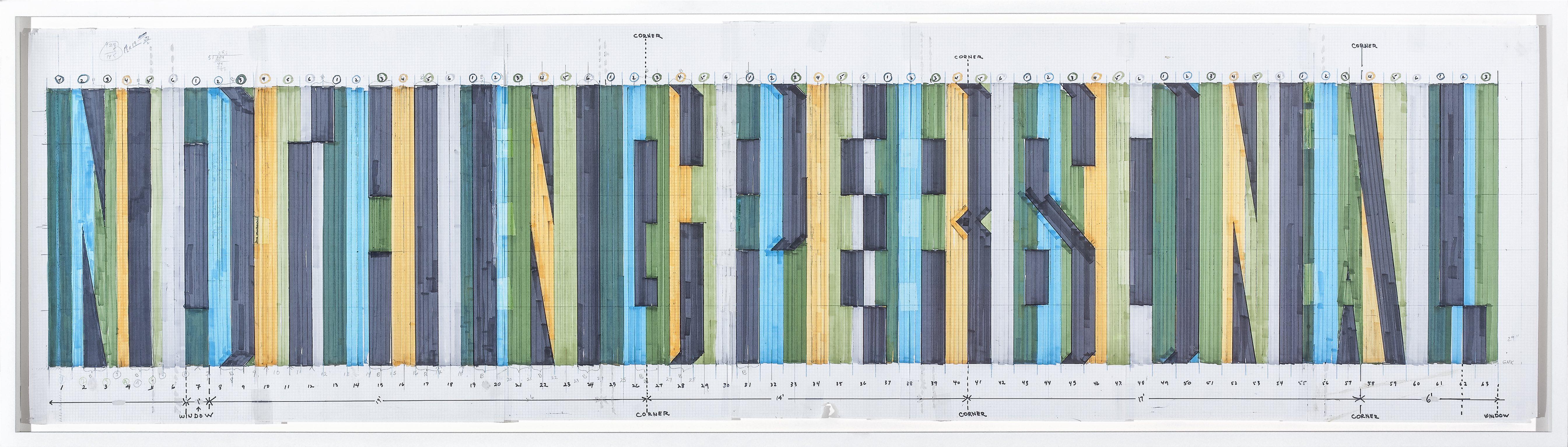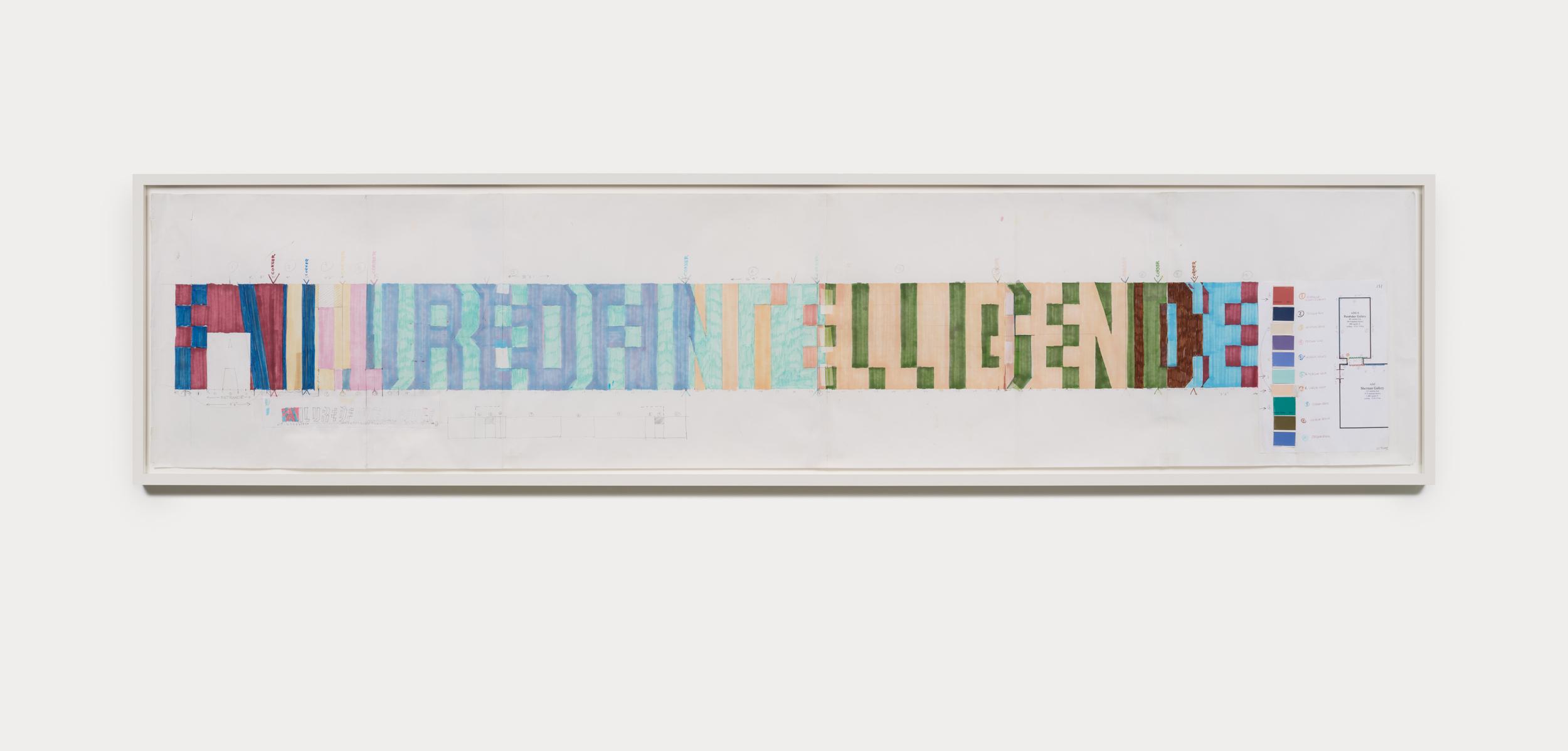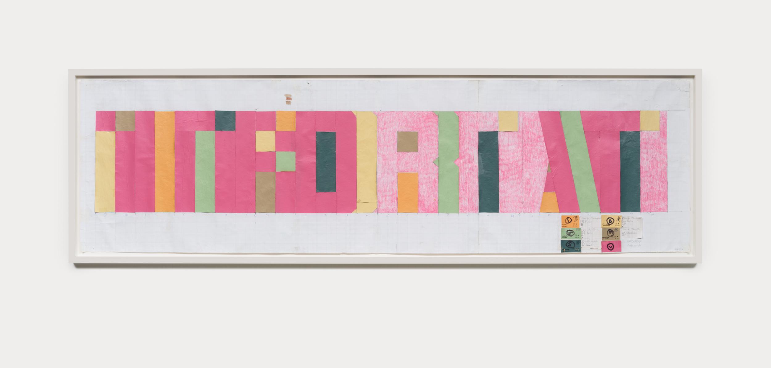 Over the years Kennedy created numerous scale drawing for his large wall-text paintings. This meticulous planning work tied in with his love of counting and rational art production. While installing, Kennedy would tack these drawings up by the walls he was working on, referring to them constantly while taping and measuring. These scale drawings provide a window into the reasoning and artistic logic underlying these iconic works.