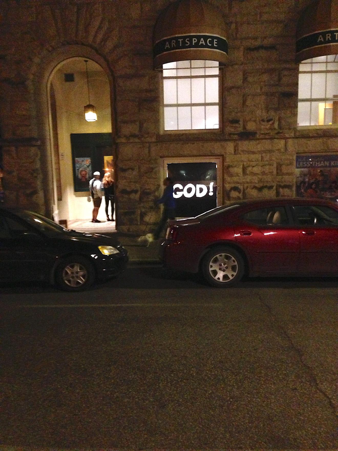 Exhibited as an outdoor installation from September 3 - October 31, 2013, GOD! equally presents an expression of exasperation or disbelief, as an exclamation of praise. The work was installed at street level and back lit at night, creating a light box effect.