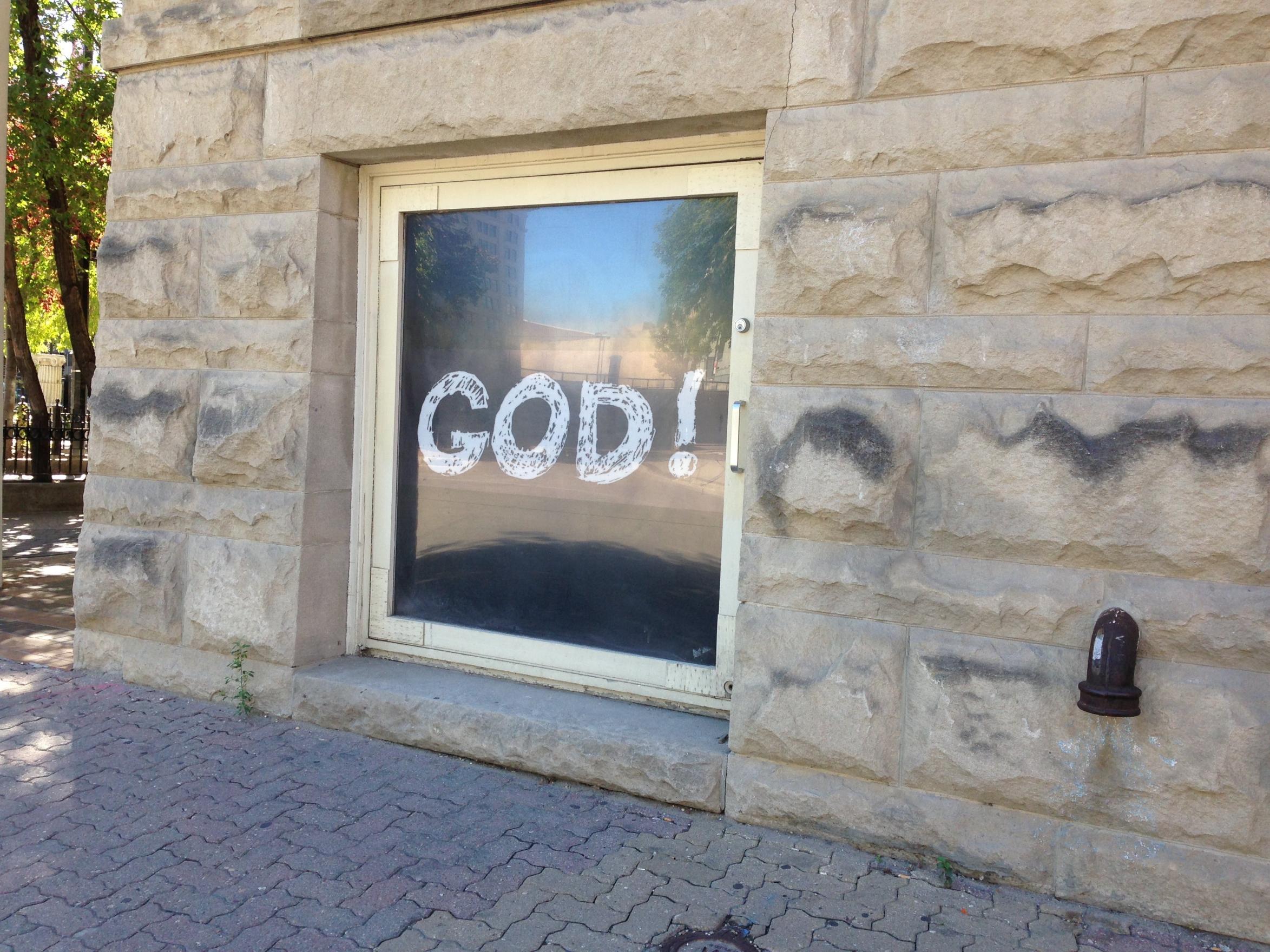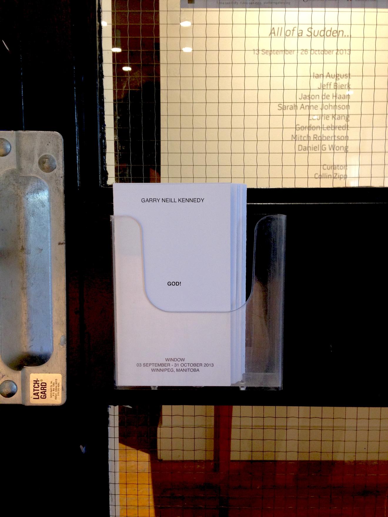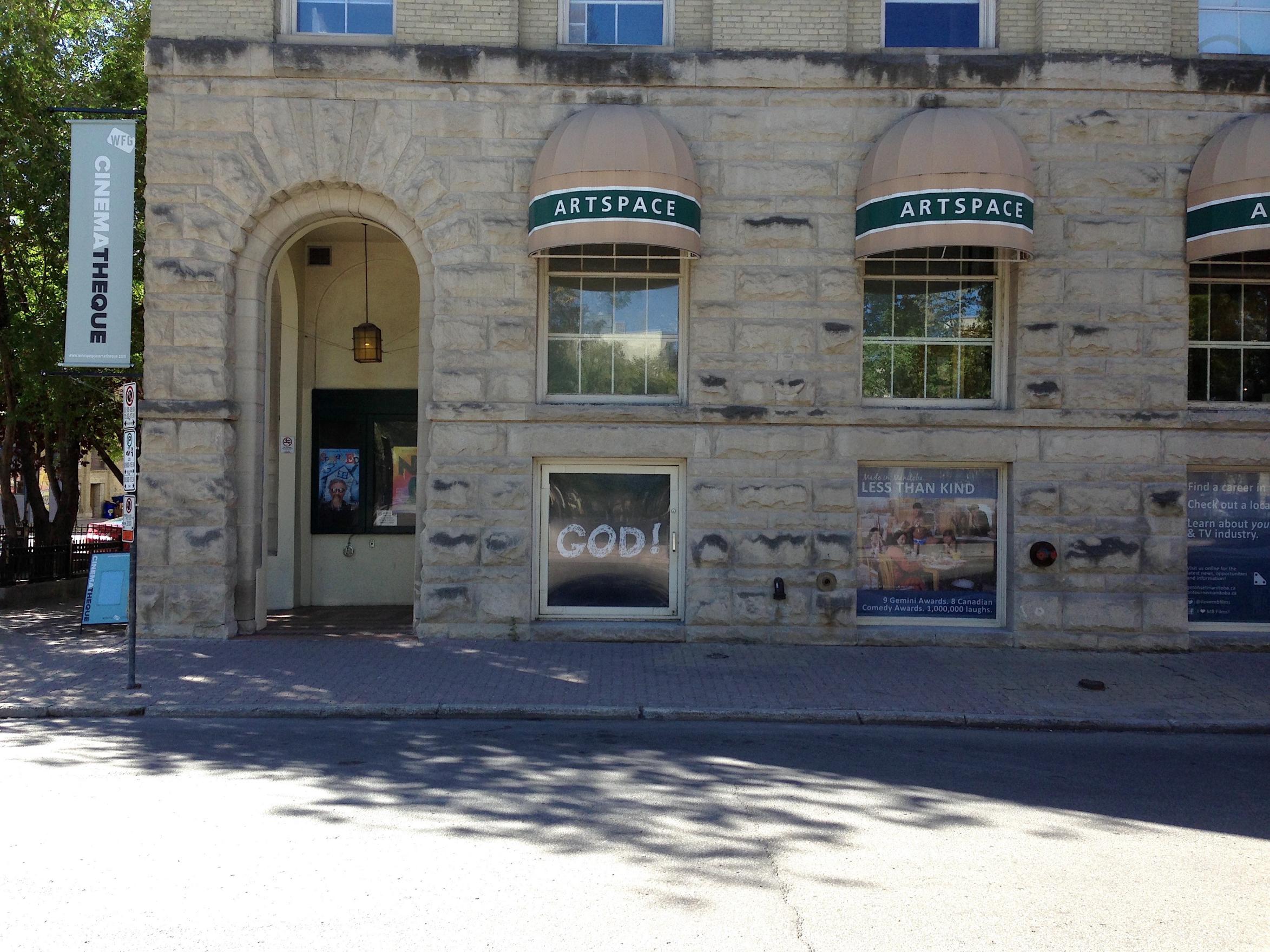 In 2013, Kennedy was invited to do a window-well work for Platform Centre for Photographic + Digital Arts (Winnipeg). Kennedy developed GOD! at a period when he was thinking around conflicts stemming from differenced in religious beliefs, and more specifically religion's role in socio-political tensions between North America and the Middle East (see Kennedy's Ethics 101 series, including AN EYE FOR AN EYE (2005), THE COLOURS OF CITIZEN ARAR (2007), and QUID PRO QUO (2012)). Through his conceptual practice, Kennedy was taking the temperature of religious anxieties and offering a critique of the problematic associative leap between religious dedication and fanaticism or extremism.