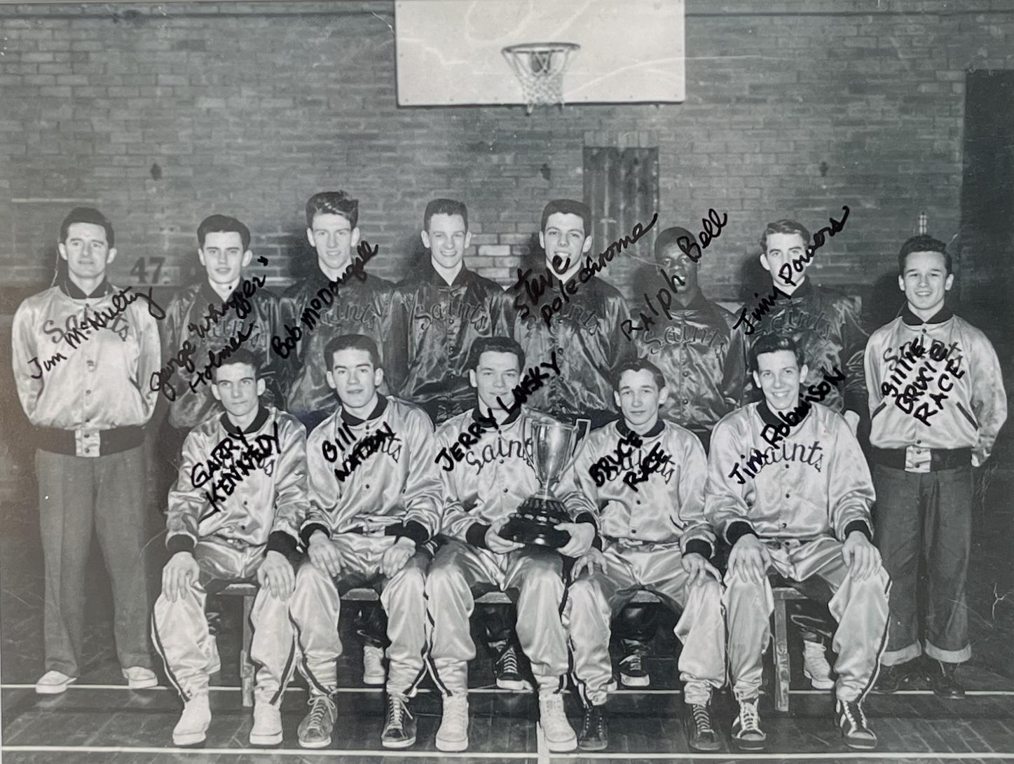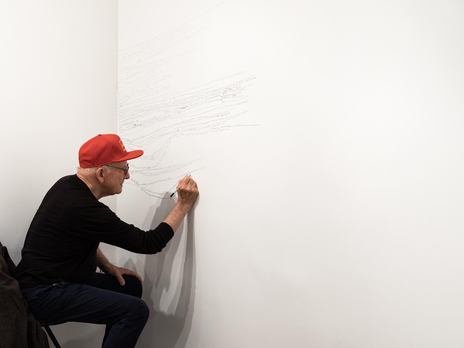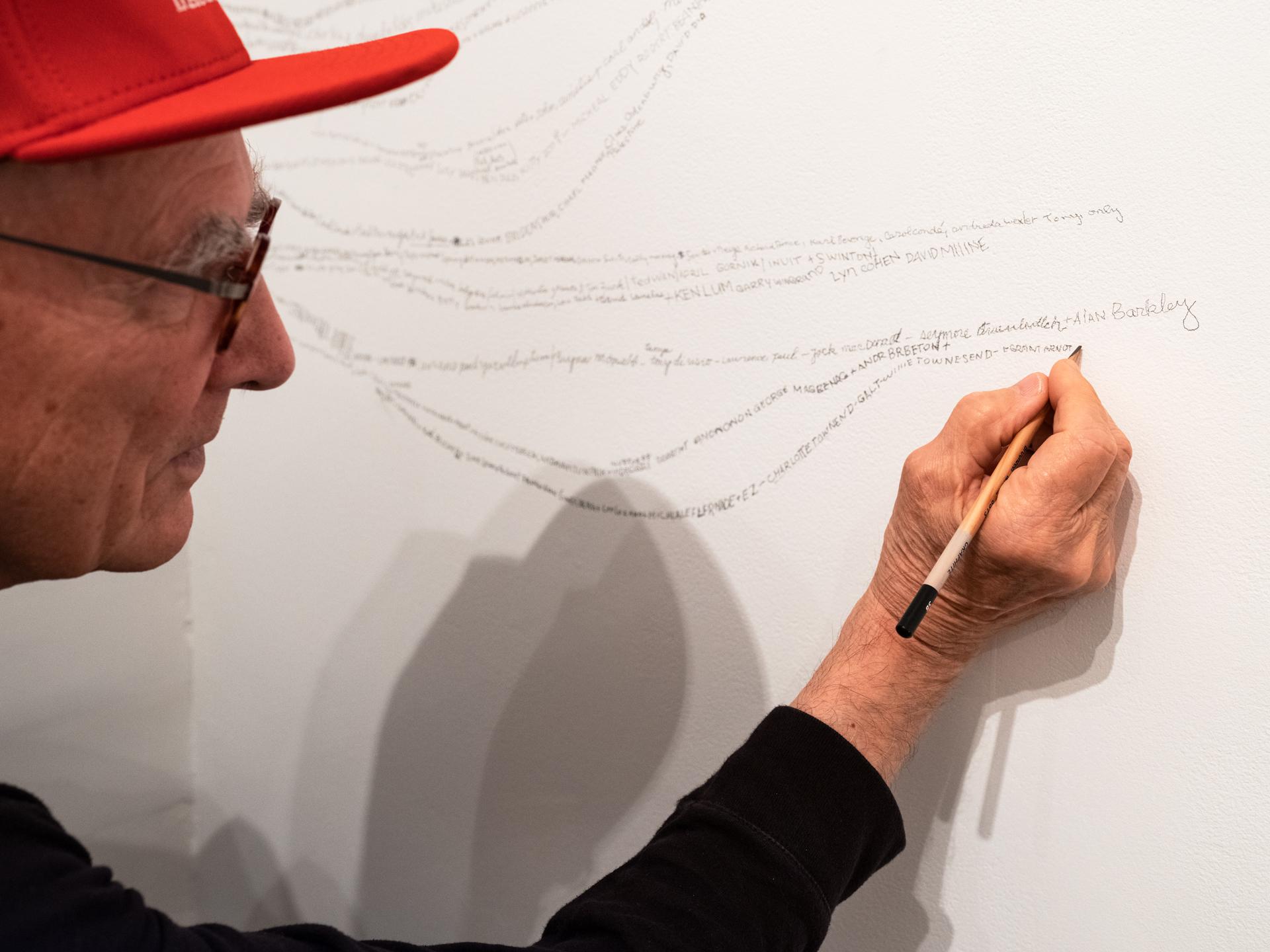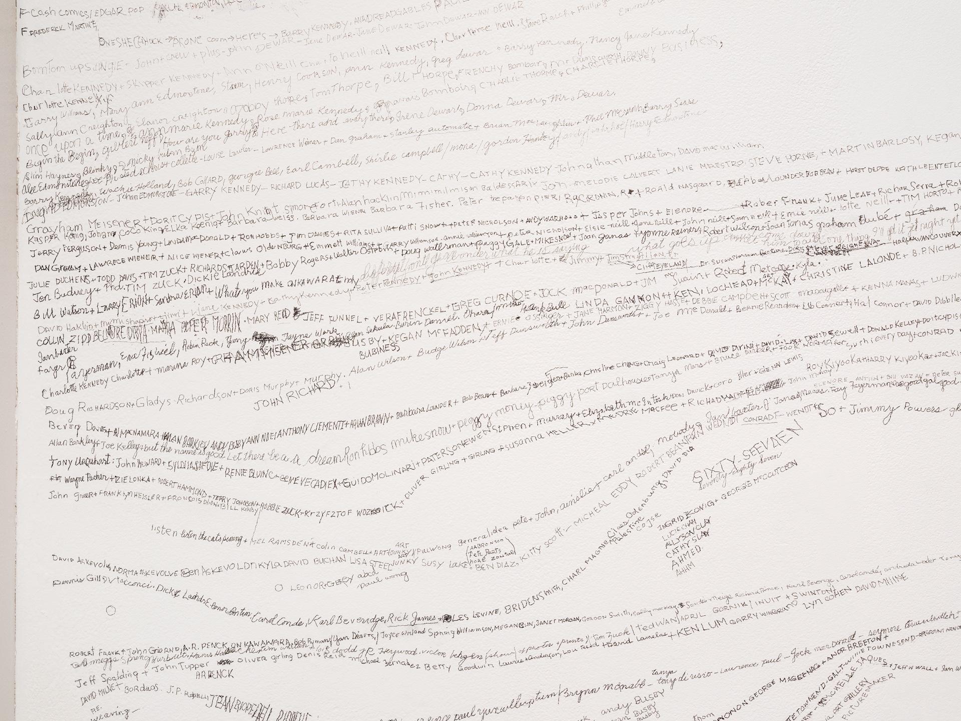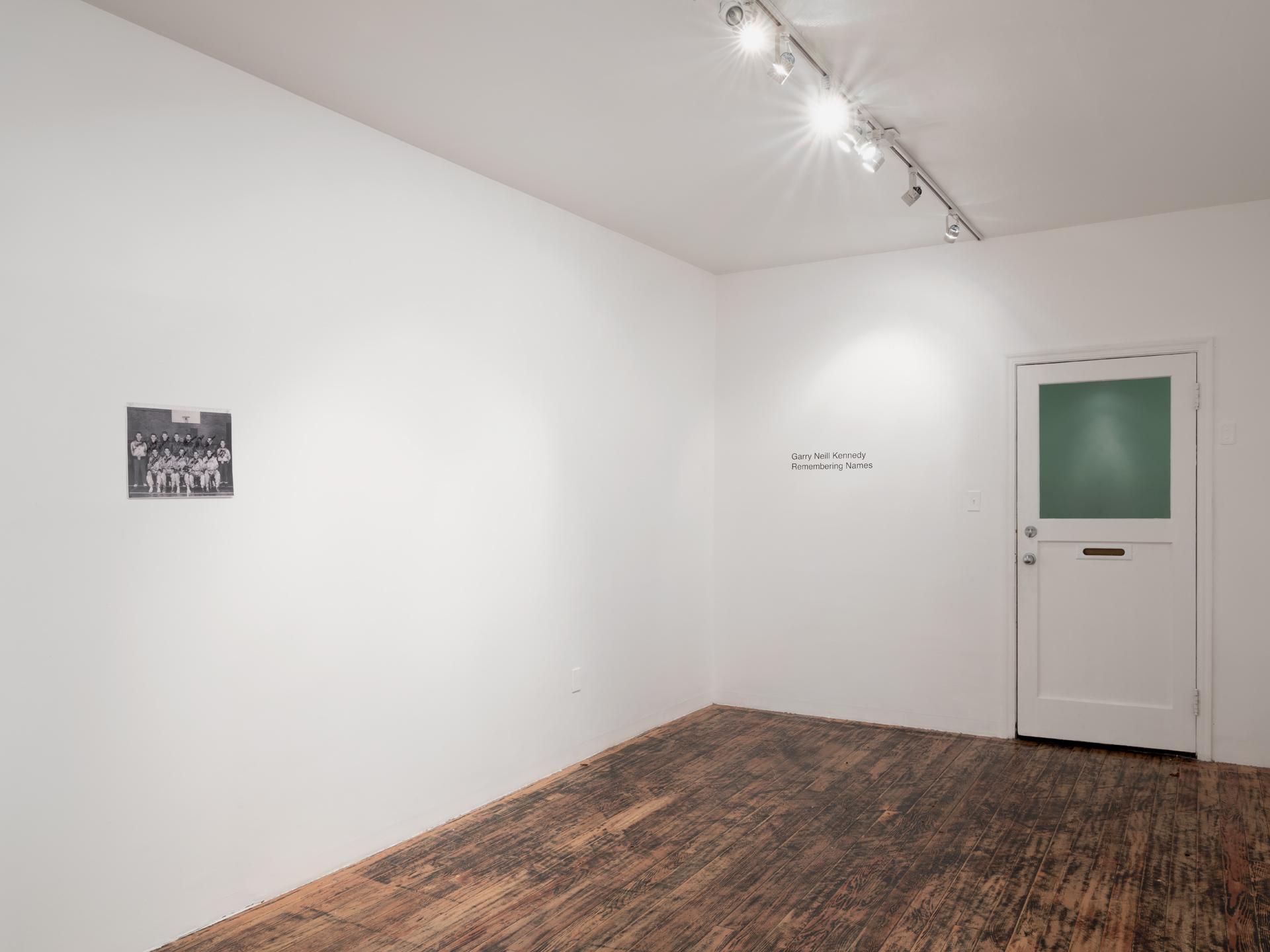 Remembering Names was exhibited at CSA Space in 2018. For this installation, Kennedy returned to his long-time practice of remembering names at a point in his life when he was living with dementia and actively trying to remember as much as he could. Over a several week installation period, Kennedy sat in the gallery, accompanied by a family member or a friend, and “remember[ed] the names of everyone I ever met," writing them in pencil on the wall of the gallery. Alongside with this installation hung Saint Catharines Saint's Basket Ball Champions, a photograph of Kennedy's high school basket ball team over which he'd written the names of the players.