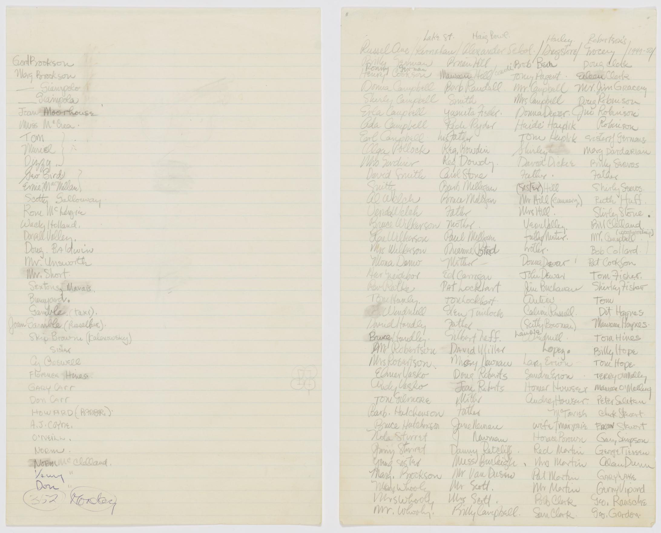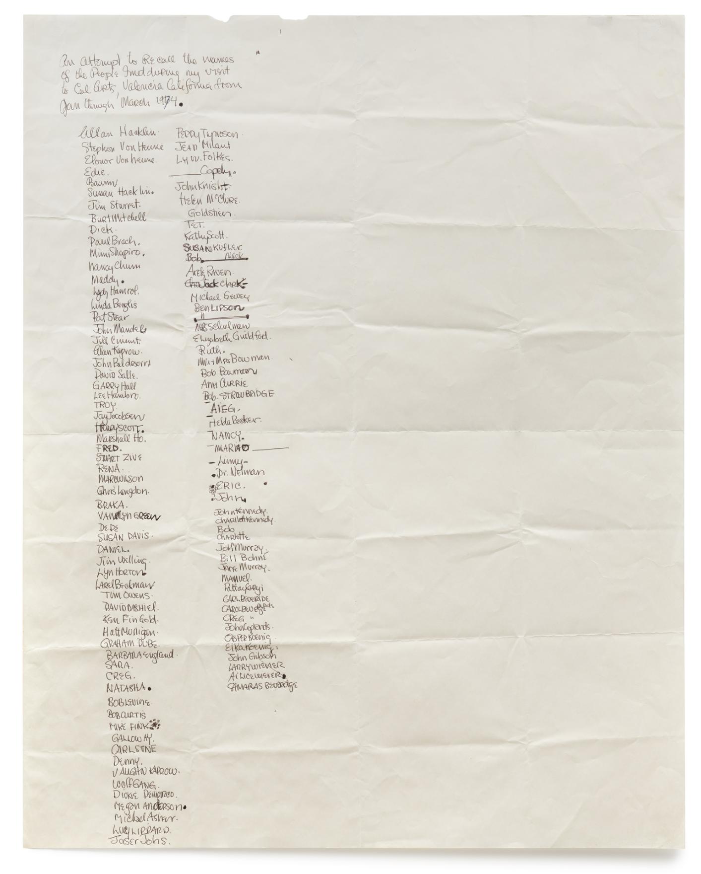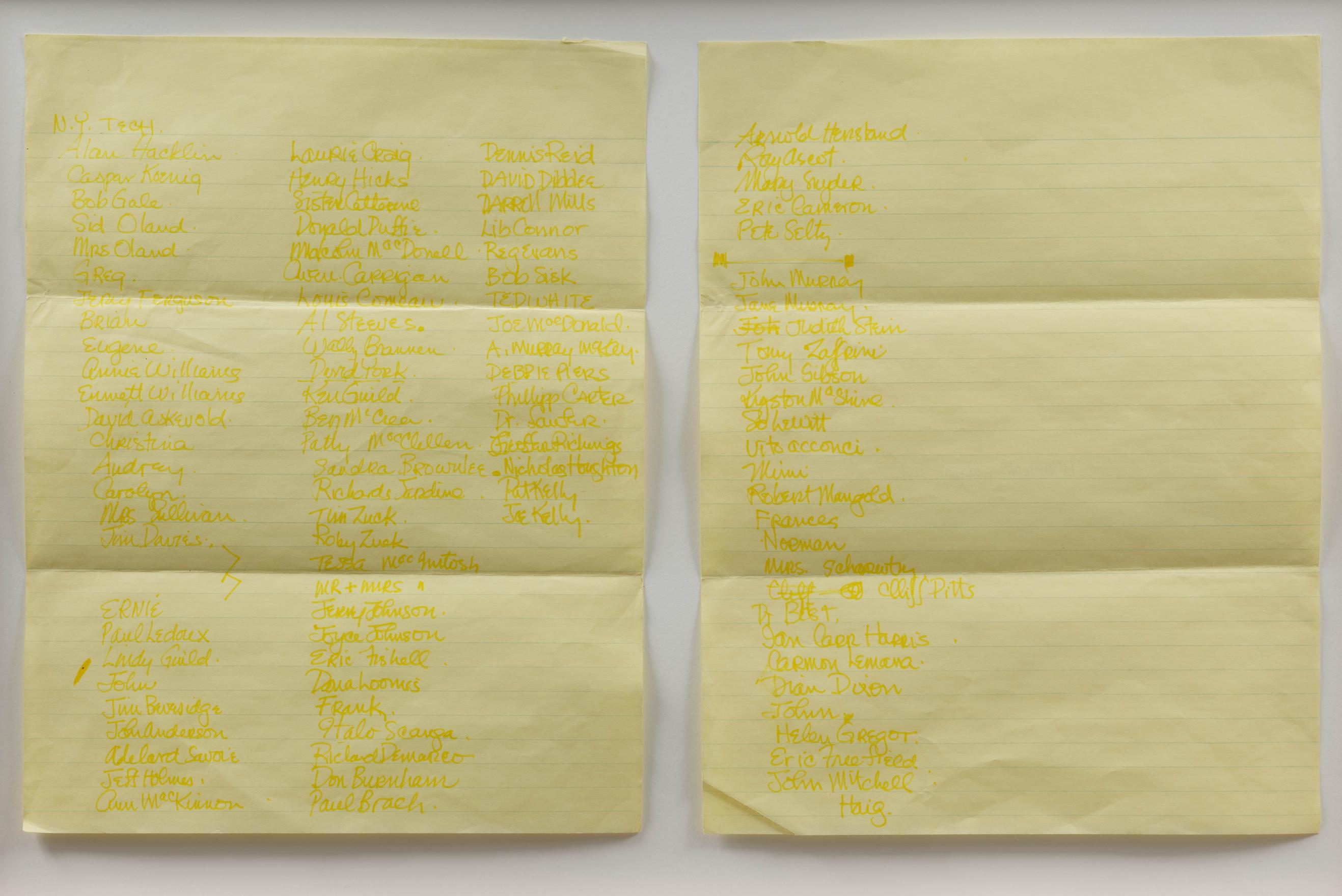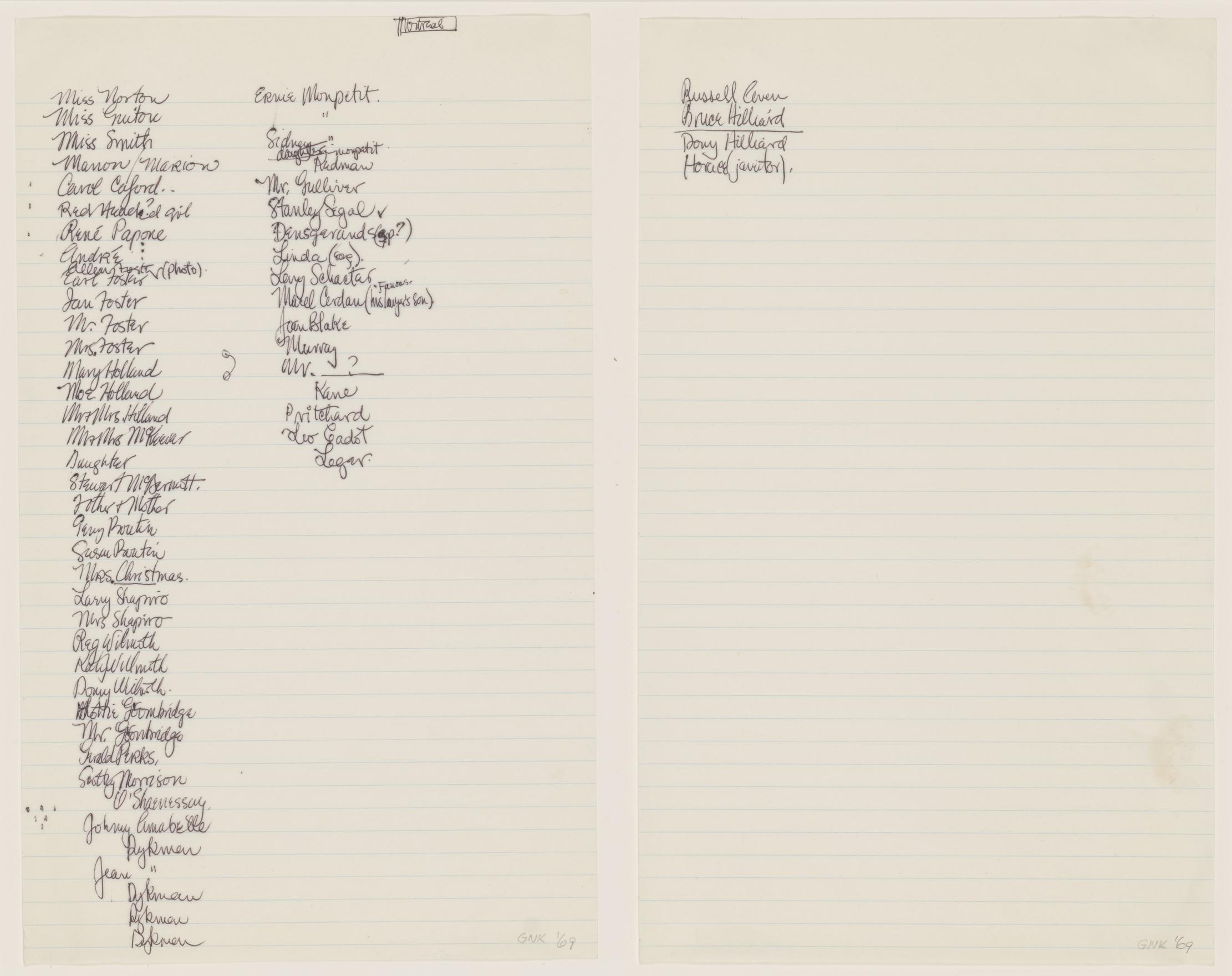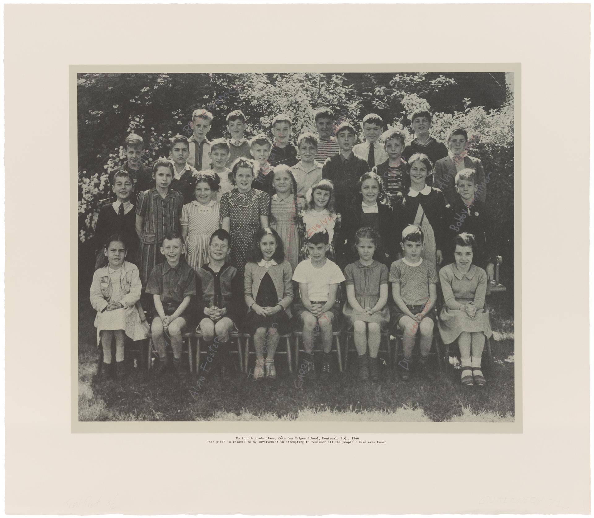 Remembering names was an ongoing practice for Kennedy dating back to the early 1970s. Over the years he would create lists of people from places he used to live (St. Catharine's and Montreal) or after stints away from home (NY Tech and Cal Arts). In 1972, he made My Fourth Grade Class, a series of lithographs remembering names of his elementry school class mates from Côte-des-Neiges School (Montreal, QC, 1946).