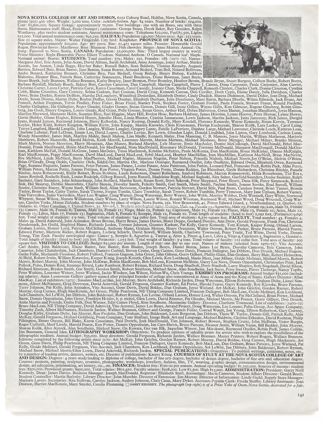 While grounded in a memory work, for Kennedy, this practice was also a means of taking stock and acknowledging those around him. In 1972, when asked to write a piece for Studio International Journal of Modern Art about innovative education practices in Nova Scotia, rather than describe it in a narrative, Kennedy created Page. 141. This page work consisted of a dense list of the entire Nova Scotia College of Art and Design community including maintenance workers, students, faculty, visitors, and administrators.