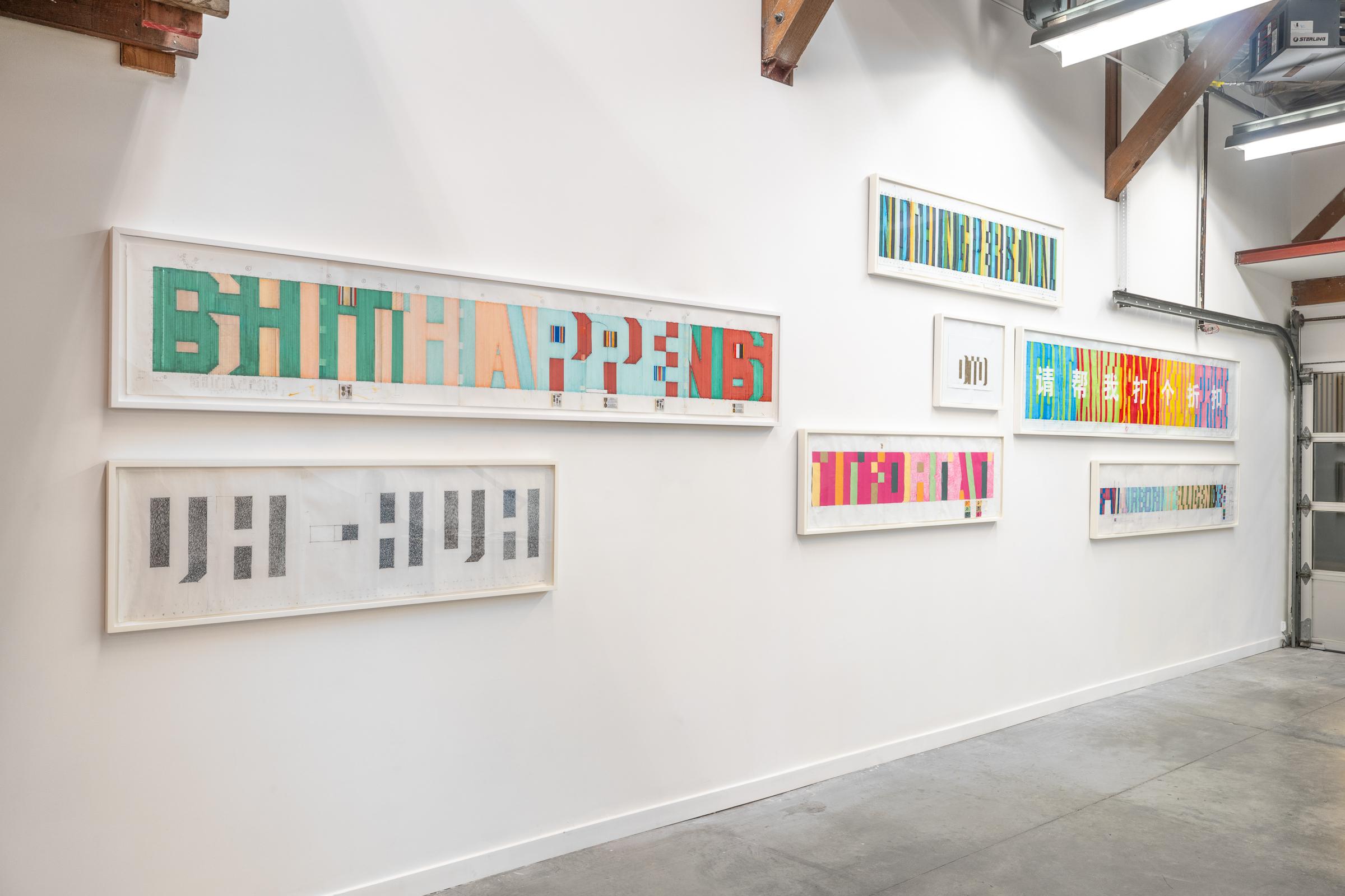 Among the eight working drawings on view are I DON’T WANT TO PAY THE FULL PRICE (Centre A, Vancouver, 2009); UH-HUH (S.L. Simpson Gallery, Toronto, 1992); FAILURE OF INTELLIGENCE (McMaster University Art Gallery, Hamilton, 2005), and SHIT HAPPENS (CANADA, New York City, 2006). Each are poignant phrases, the first excerpted from the Lonely Planet phrase book, and presented in both English and Mandarin; the latter two clipped from news reporting on the American invasion of Iraq (2003). The colour palettes of these floor-to-ceiling wall paintings were often sourced from the names of house-paints. The font emerges from variations on Kennedy’s signature Superstar Shadow.
