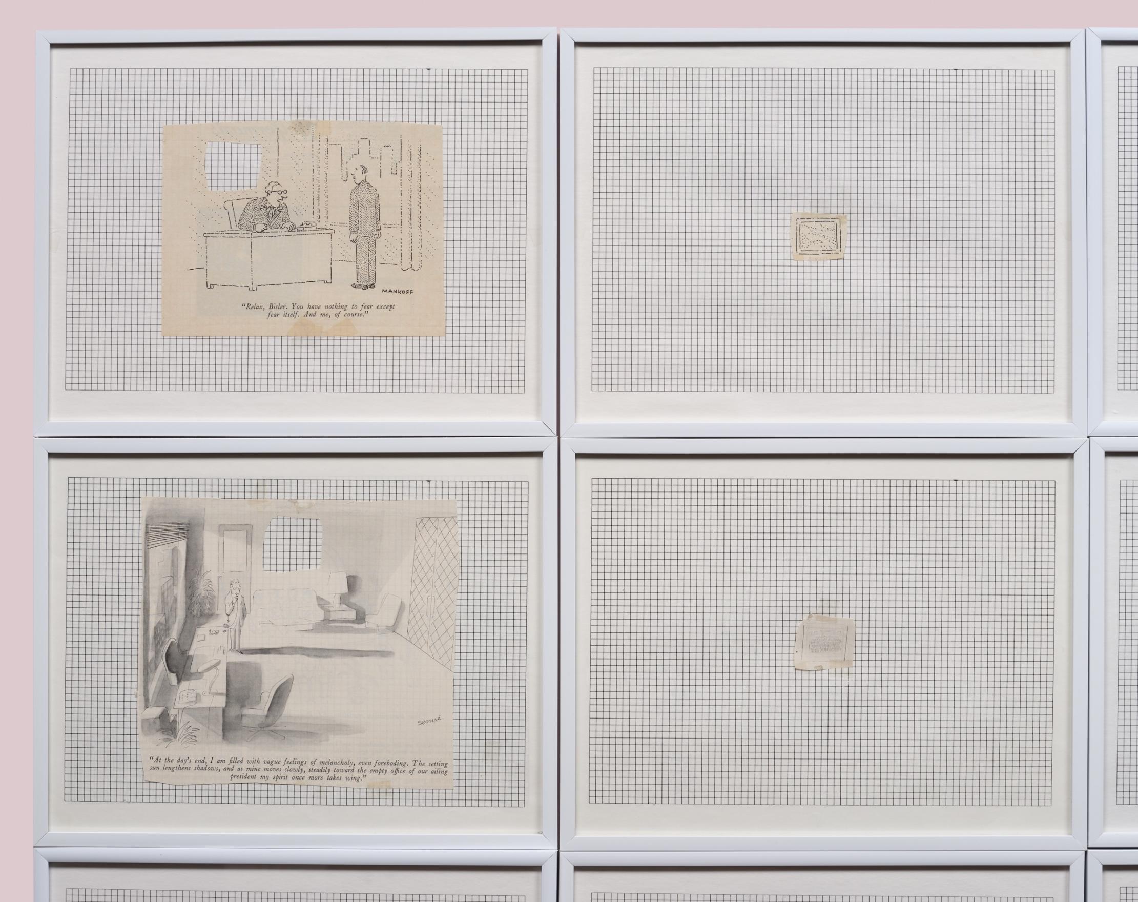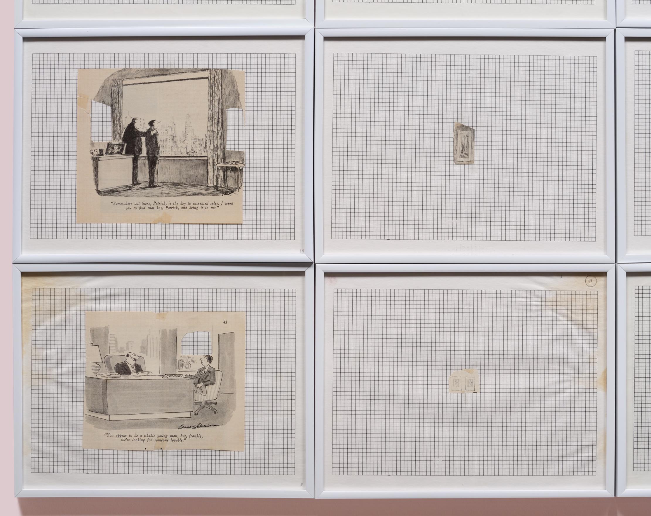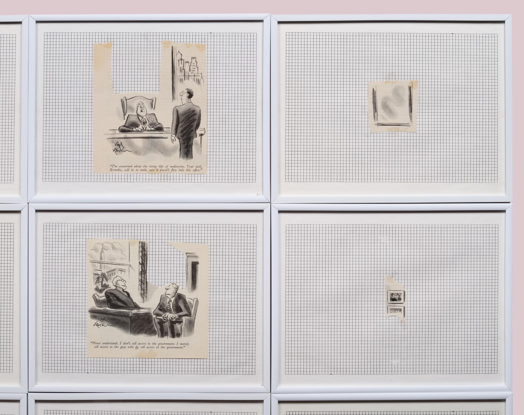 The SEIZED prints began with a collection of Saturday Evening Post and Collier’s magazines dropped off for Kennedy at his Nova Scotia College of Art and Design office where he was President. In them, he found and cut out the single-panel gag cartoons that took place in bosses’ offices, and titled them SEIZURES. Then he cut out the schematic paintings from each of the cartoon’s office walls and titled them SEIZED.