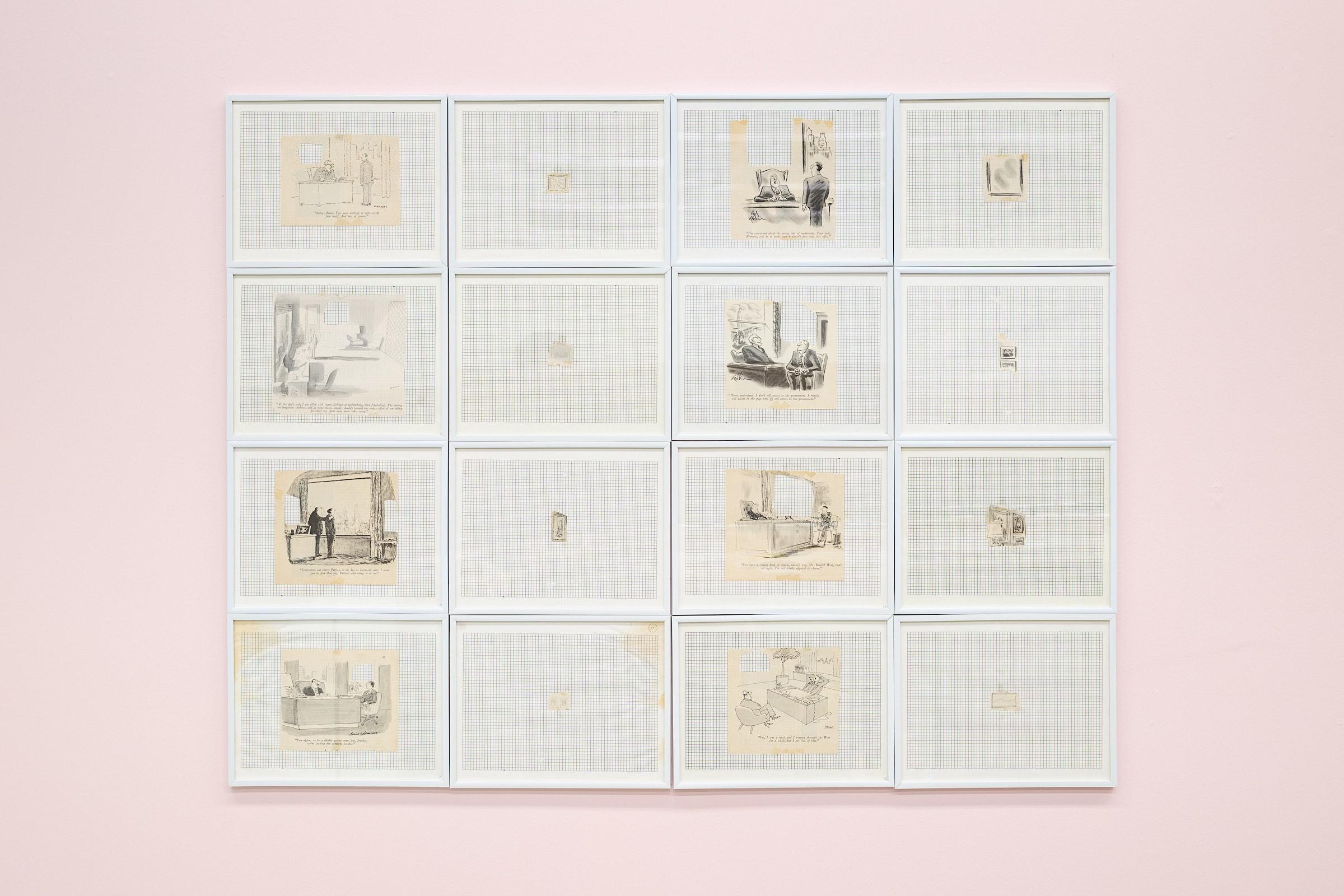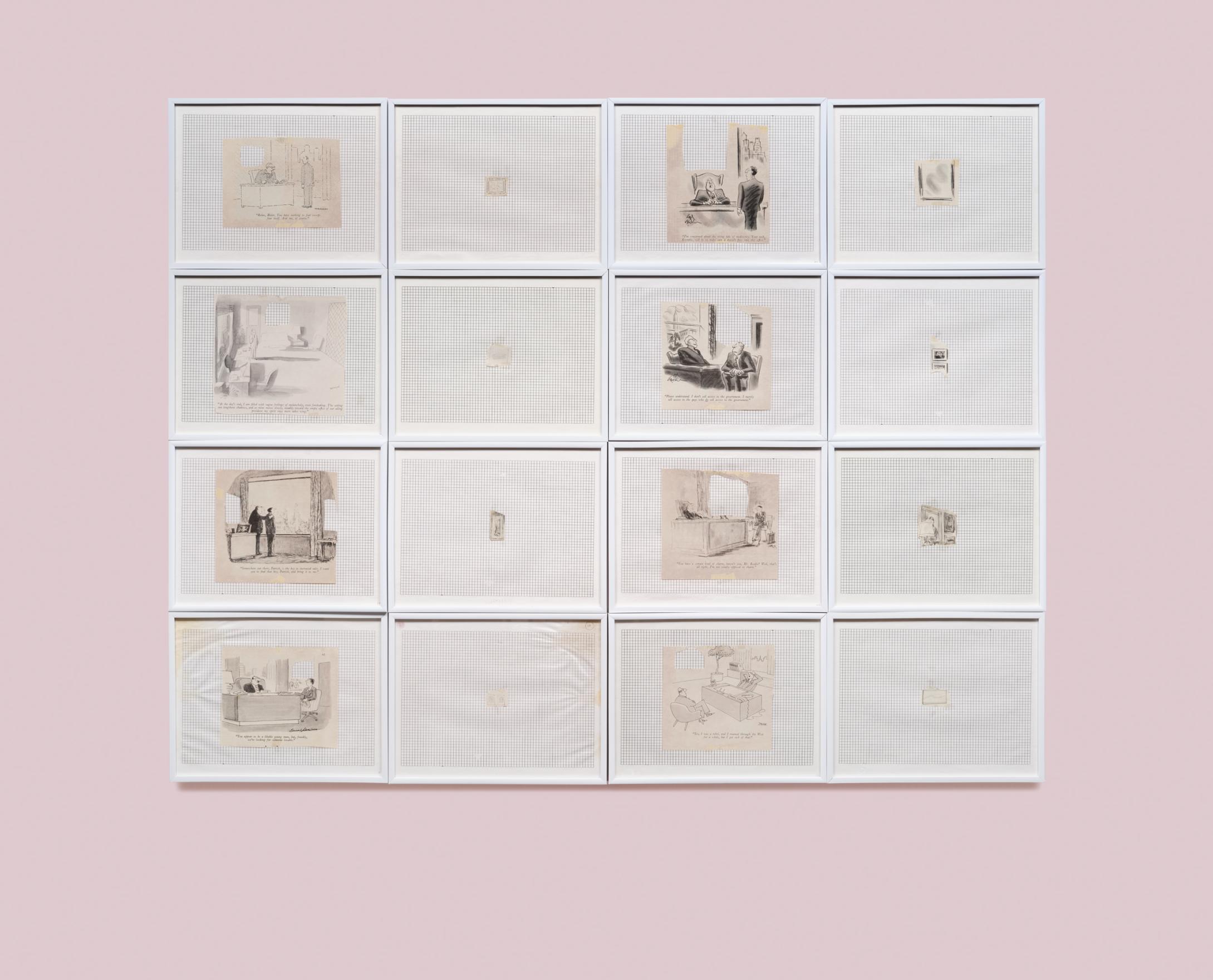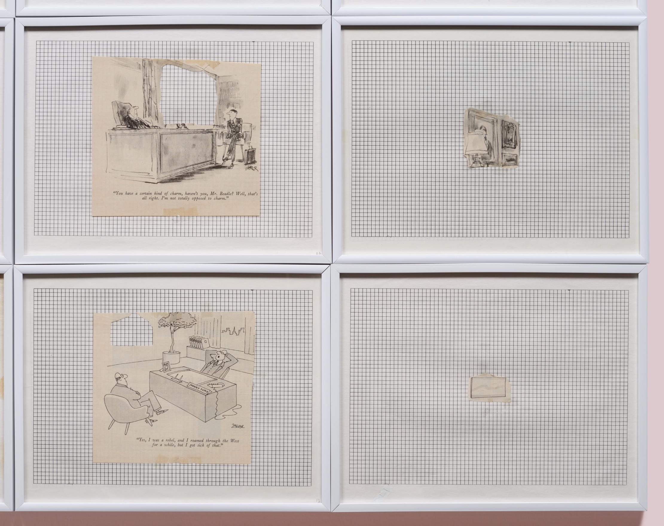 The SEIZED prints began with a collection of Saturday Evening Post and Collier’s magazines dropped off for Kennedy at his Nova Scotia College of Art and Design office where he was President. In them, he found and cut out the single-panel gag cartoons that took place in bosses’ offices, and titled them SEIZURES. Then he cut out the schematic paintings from each of the cartoon’s office walls and titled them SEIZED.